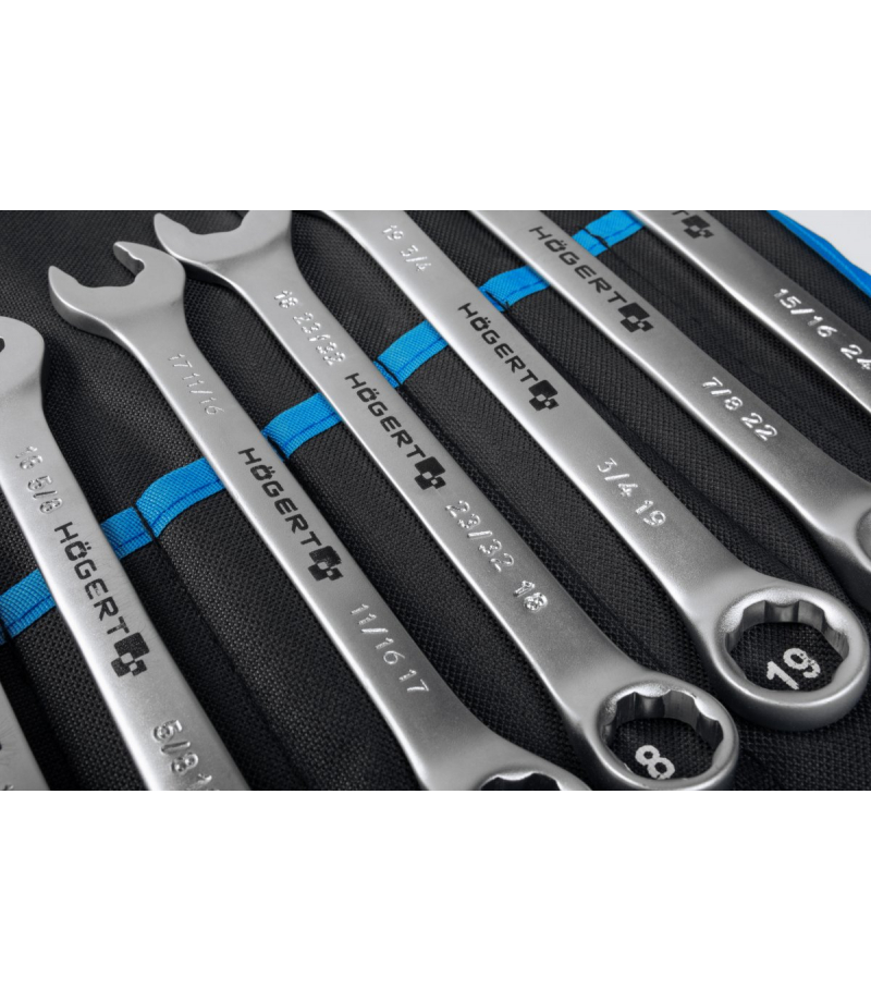 Zestaw zawiera klucze płasko oczkowe oraz materiałową płachtę z oddzielnymi kieszonkami na każdy z nich. Klucze wykonano z wysokogatunkowej, twardej i wytrzymałej stali chromowo - wanadowej, dzięki czemu mają wysoką odporność na korozje oraz powstawanie rdzy. Klucze są odporne na zniszczenia i odszktałcenia, przez co znajdą zastosowanie podczas pracy nawet w trudnodostępnych miejscach. W zestawie znajduje się praktyczna płachta z przegródkami na każdy klucz, ułatwiająca przechowywanie, organizację i szybki dostęp do potrzebnego sprzętu.