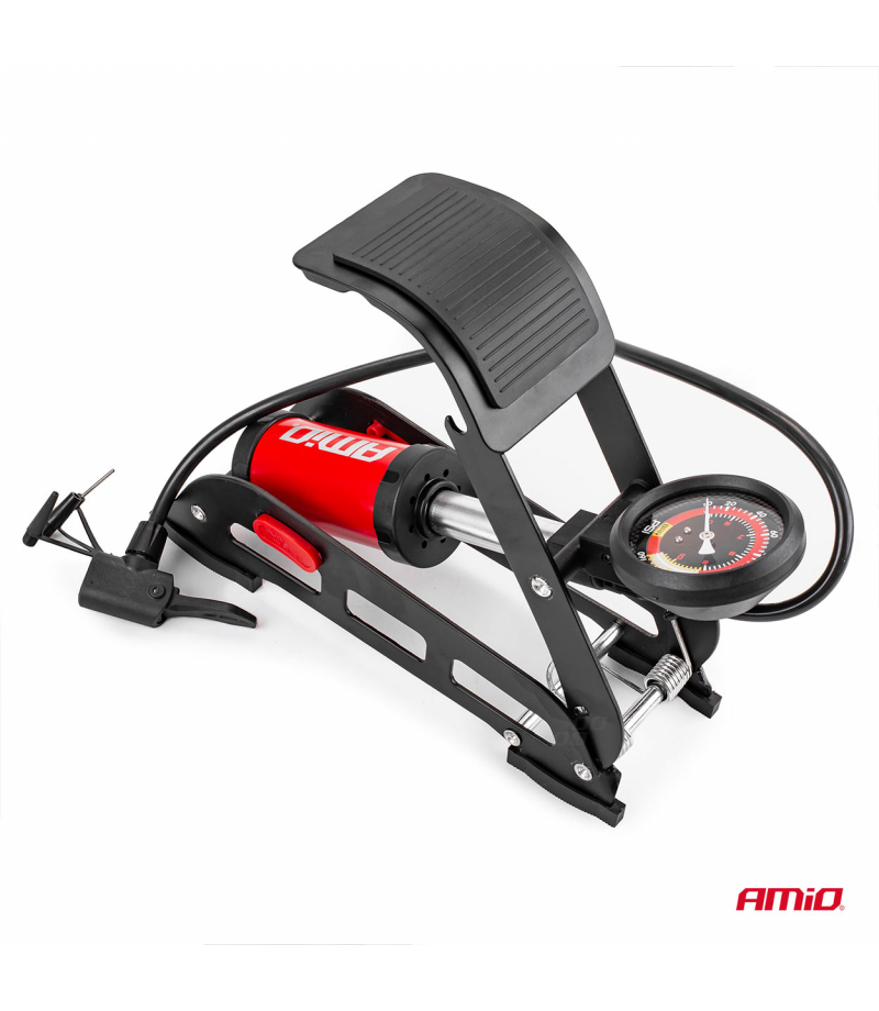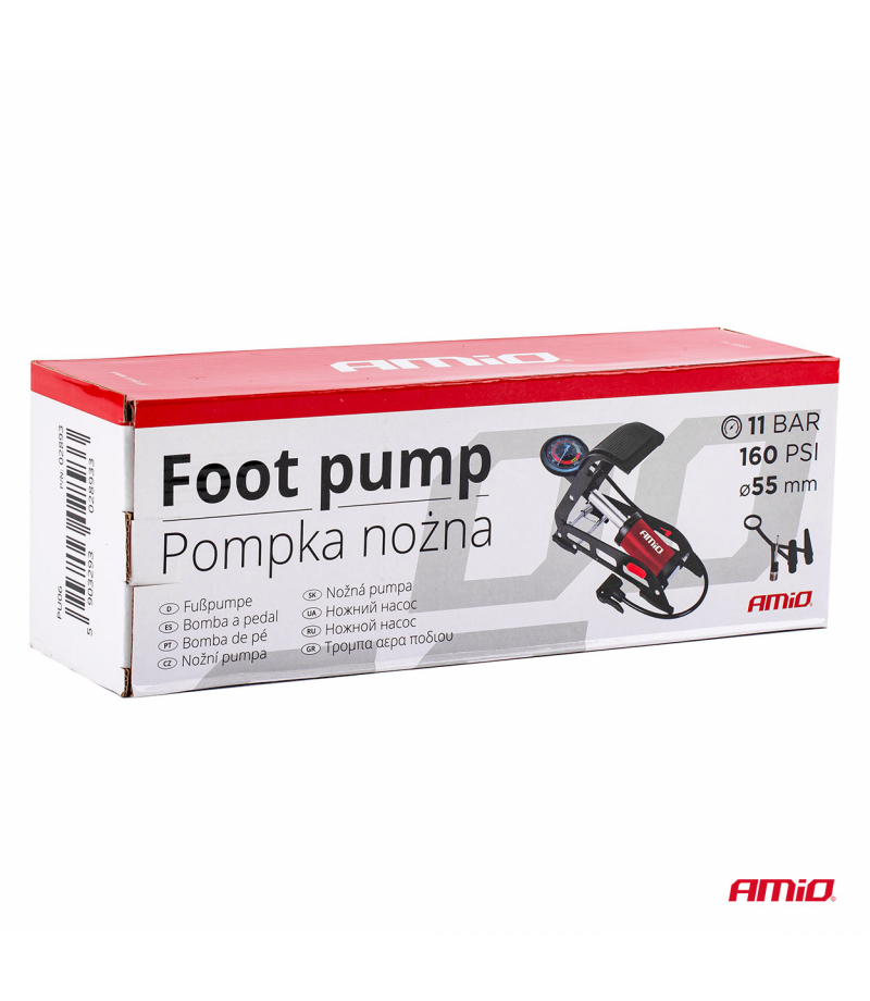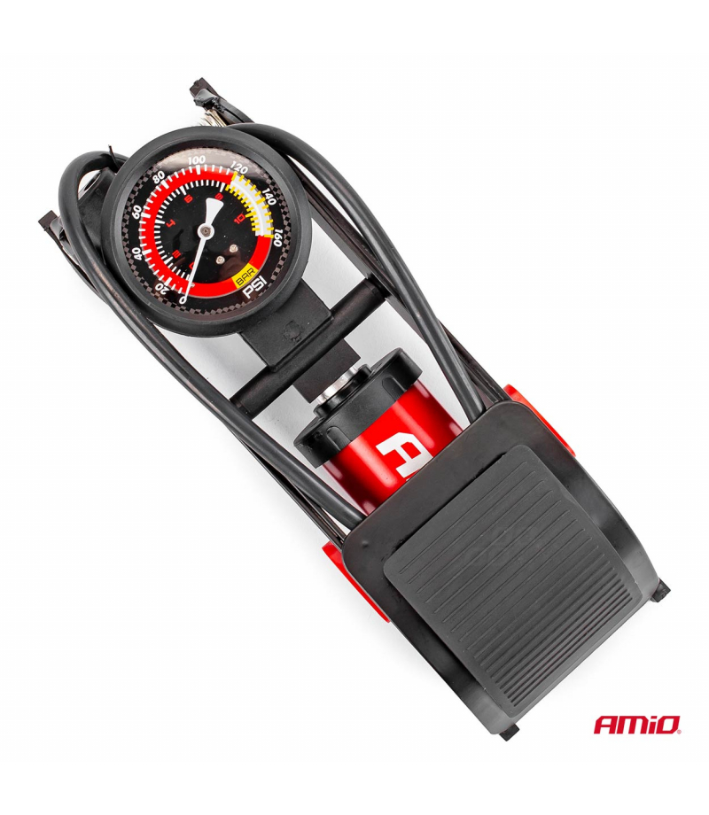Pompka nożna jednotłokowa o solidnej konstrukcji, wykonana z tłoczonej, lakierowanej blachy stalowej o grubości 3 mm. Pedał pokryty gumą dla lepszej stabilizacji. Czytelny manometr pokazujący w barach (0-11) oraz PSI (0-160). Trwały i elastyczny wąż o długości 750 mm. W zestawie trzy adaptery. Idealna dla profesjonalnych serwisów jak i gospodarstw domowych.