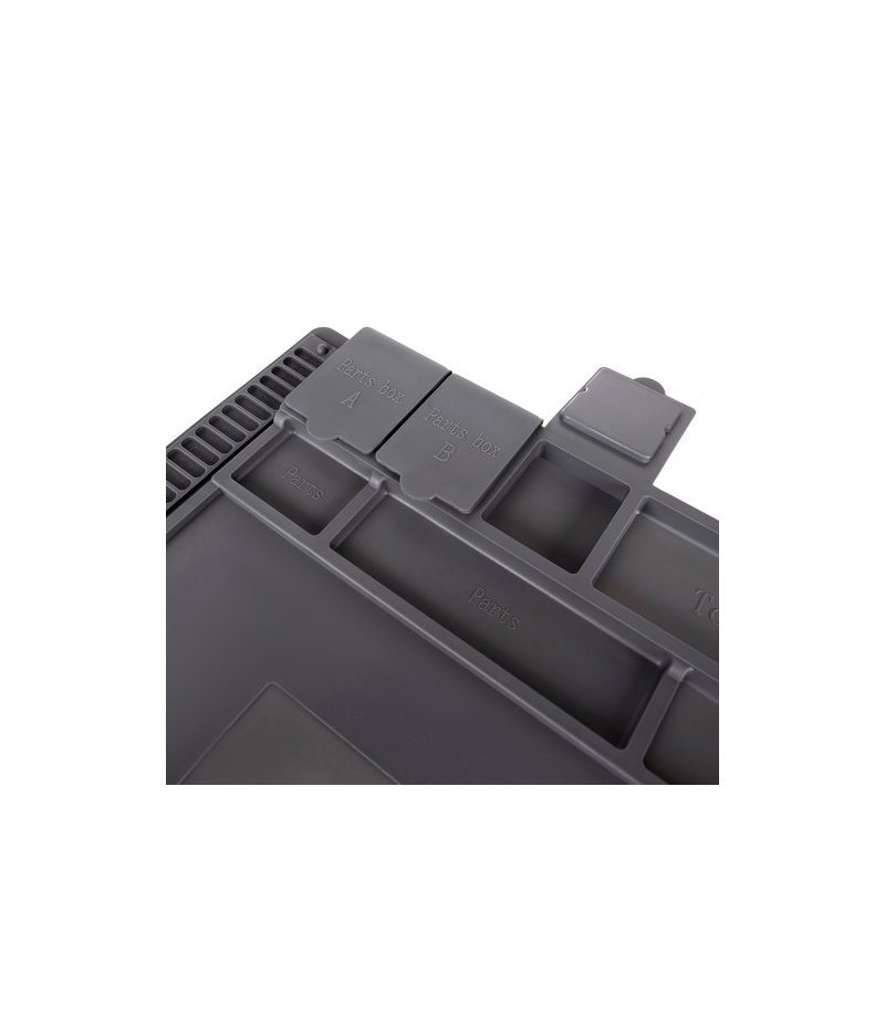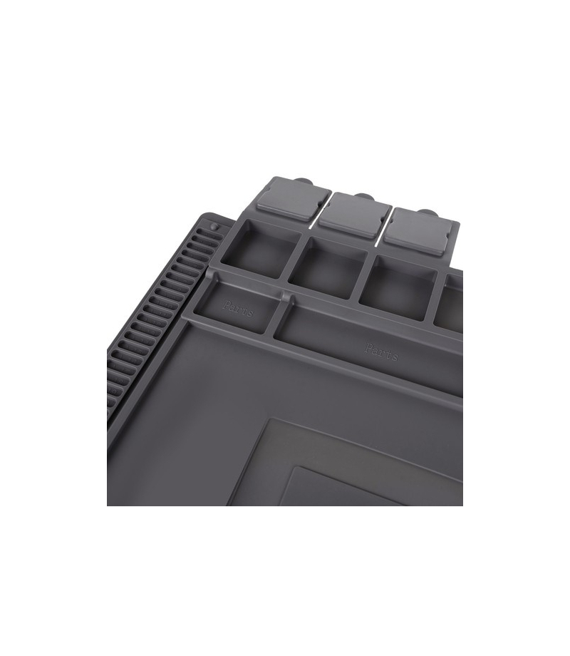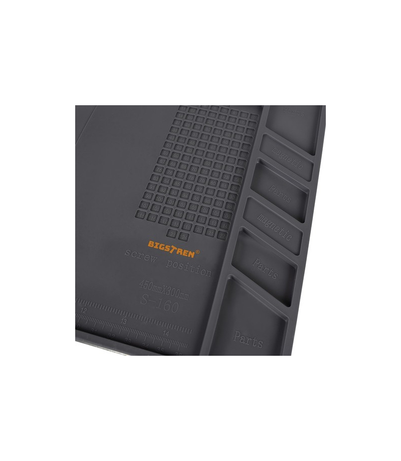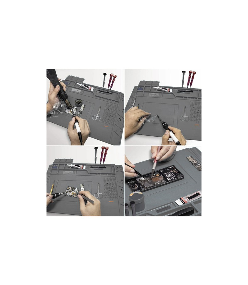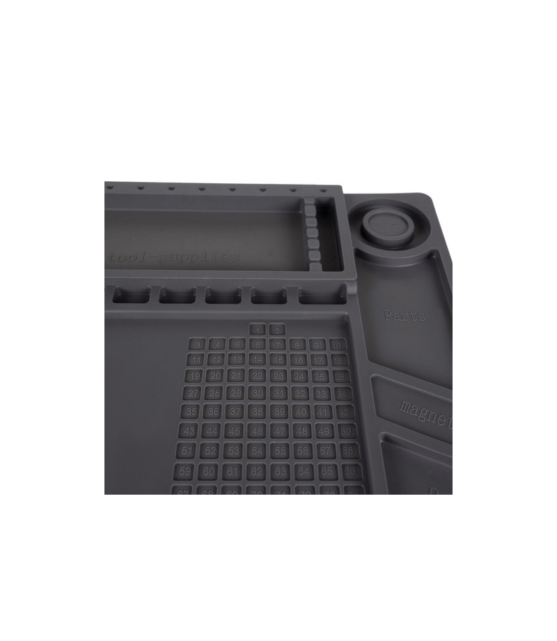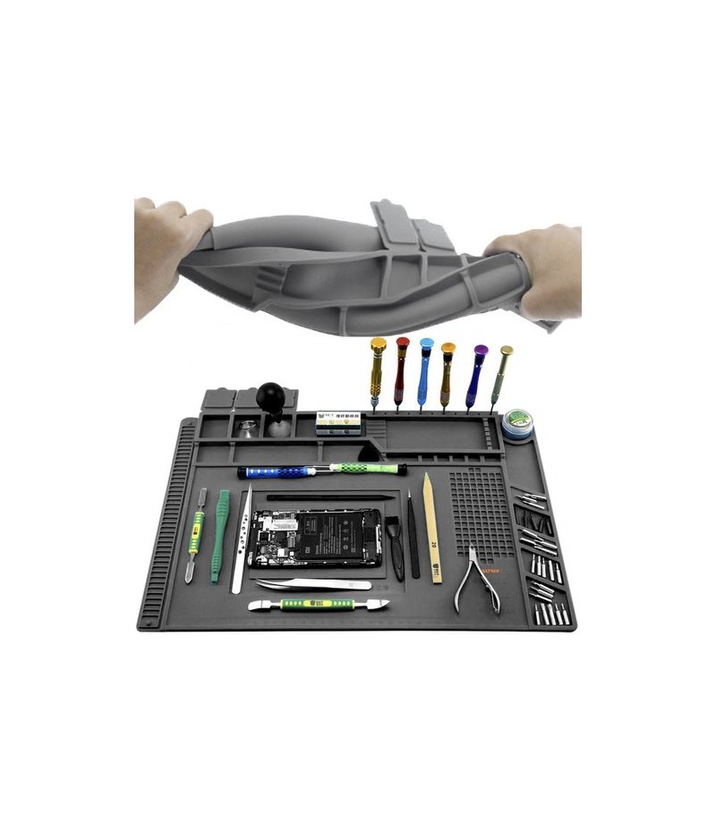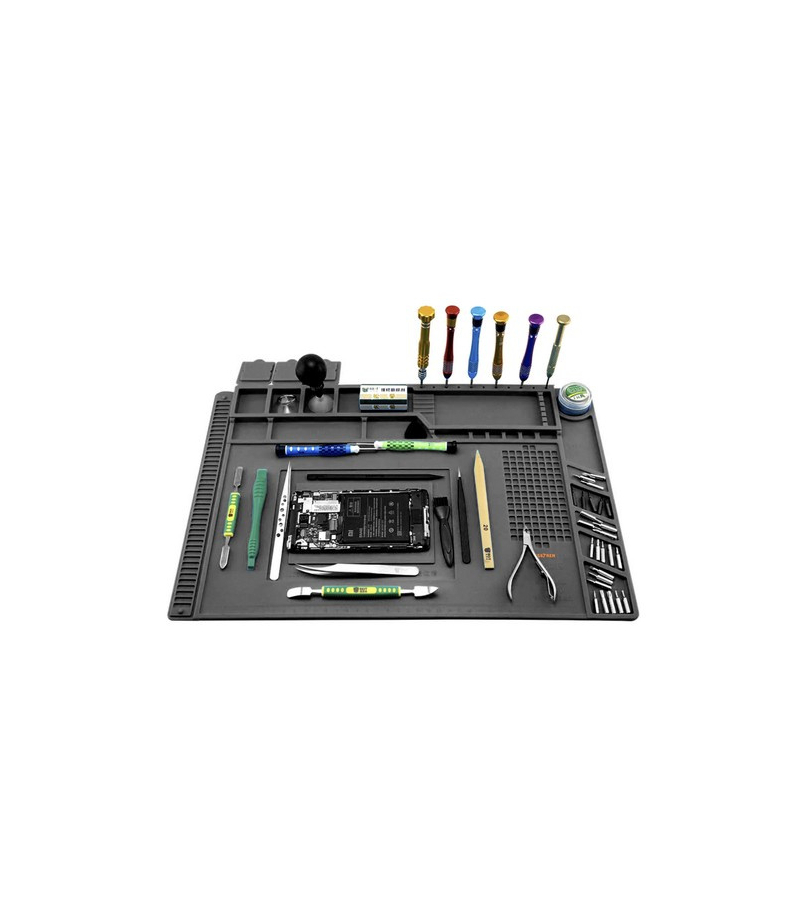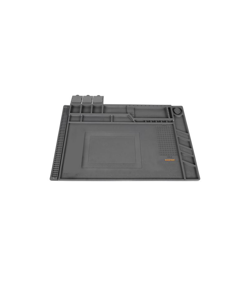 Wielofunkcyjna, silikonowa mata serwisowa to niezbędnik każdego amatora i profesjonalnego majsterkowicza. Znacznie ułatwia wykonywanie wszelkich napraw elektroniki oraz lutowanie. Odporna na wysoką temperaturę (nawet do 500 stopni Celsjusza) oraz odkształcanie się. Posiada 4 magnetyczne punkty: do namagnesowywania wkrętaków, na części i śrubki oraz liczne przegródki i podziałkę liniową w centymetrach i calach.