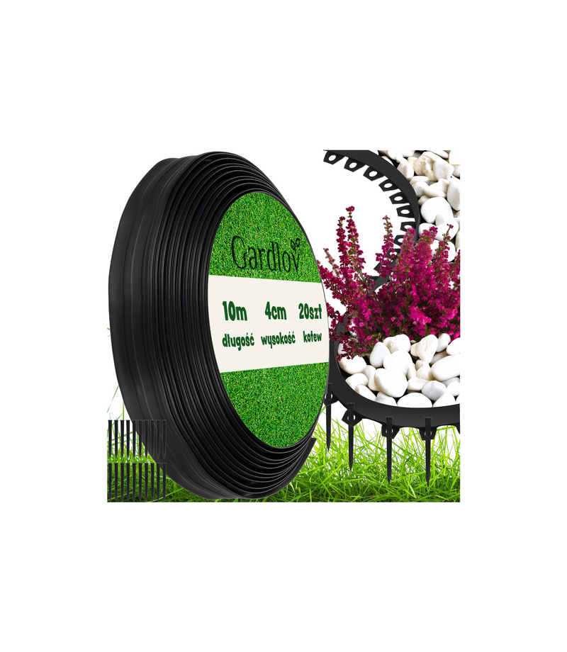 Obrzeże ogrodowe 10m czarne z 20 kołkami – elastyczne obrzeża trawnikowe do ogrodu! - stabilne nawet w trudniejszym podłożu (np. gliniastym lub piaszczystym) - w zestawie otrzymujesz aż 20 solidnych kotew montażowych o długości 18 cm , które gwarantują trwałe osadzenie nawet w mniej stabilnej ziemi , obrzeże nie przesuwa się i zachowuje formę przez długi czas - odporność na intensywny mróz, deszczem i słońce - obrzeże GARDLOV wykonane jest z tworzywa odpornego na promieniowanie...