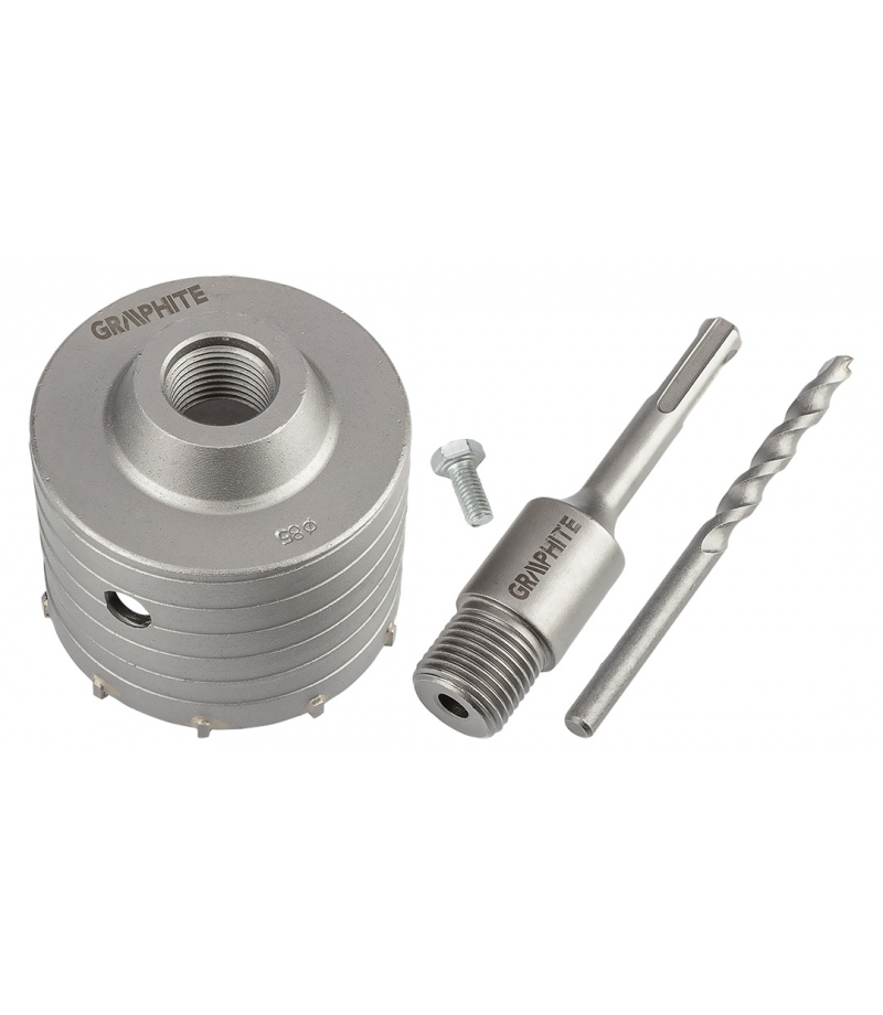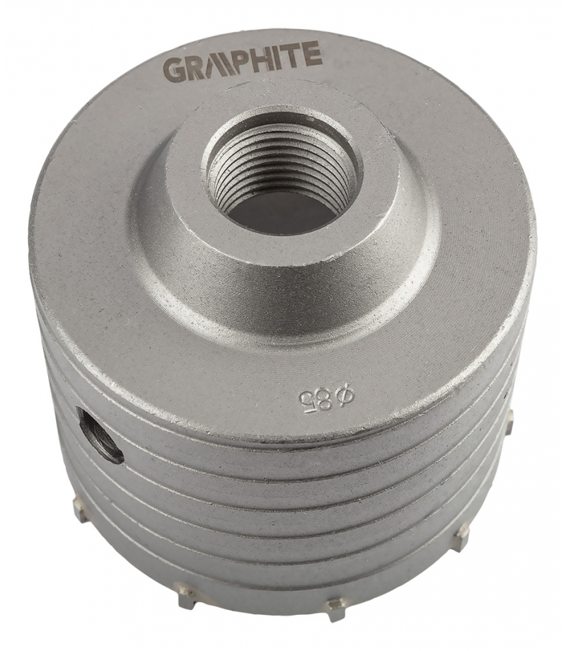 Otwornica widiowa 85 mm z adapterem SDS+ oraz wiertłem pilotującym 55H323 marki GRAPHITE charakteryzująca się średnicą otwornicy 85 mm, wysokością 72 mm i głębokością wiercenia 50 mm. Wyposażona została w 10 widii o szerokości 2,2 mm. Średnica wewnętrzna wynosi 79 mm, a parametry wiertła fi to 8 x 110 mm. Długość całego zestawu to 163 mm. Otwornica marki GRAPHITE oferowana jest w zestawie z adapterem SDS+ oraz wiertłem pilotującym. Posiada możliwość wiercenia z udarem i przeznaczona jest również do wiercenia otworów w betonie i cegle. Umożliwia przygotowywanie otworów pod puszki instalacyjne. Ostrza z drobnoziarnistego węglika spiekanego o zwiększonej odporności na ścieranie przedłużają żywotność narzędzia. Otwornica sprawdzi się w profesji budowlańca, majsterkowicza oraz elektryka.