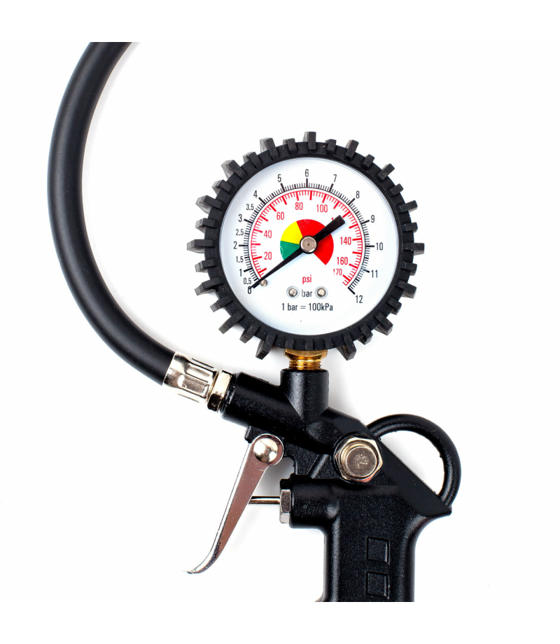 Pistolet pneumatyczny do pompowania kół z manometrem to narzędzie niezbędne w każdym garażu. Pistolet jest wygodny, lekki, praktyczny i jest estetycznie wykonany. Pistolet posiada zawór spustowy powietrza oraz gumową osłonę manometru.