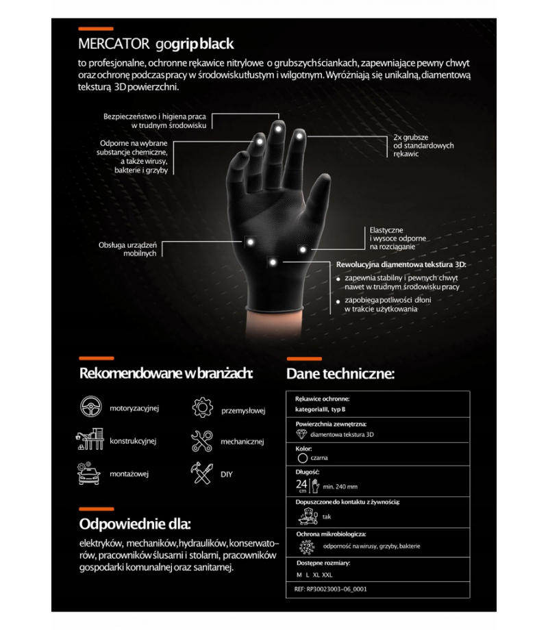 Są 3 razy grubsze od standardowych rękawiczek dostępnych na rynku. Zostały wykonane z trwałego nitrylu. Cechują się wysoką elastycznością, dużą odpornością na rozciąganie oraz unikalną diamentową teksturą 3D, która sprawia, że chwyt jest mocny i stabilny a równocześnie nie ogranicza precyzji. Oryginalna struktura MERCATOR® gogrip sprawia, że można obsługiwać urządzenia mobilne bez zdejmowania rękawiczek oraz zapobiega potliwości dłoni w trakcie użytkowania, co podwyższa komfort pracy, minimalizując ryzyko uszkodzeń skóry dłoni.