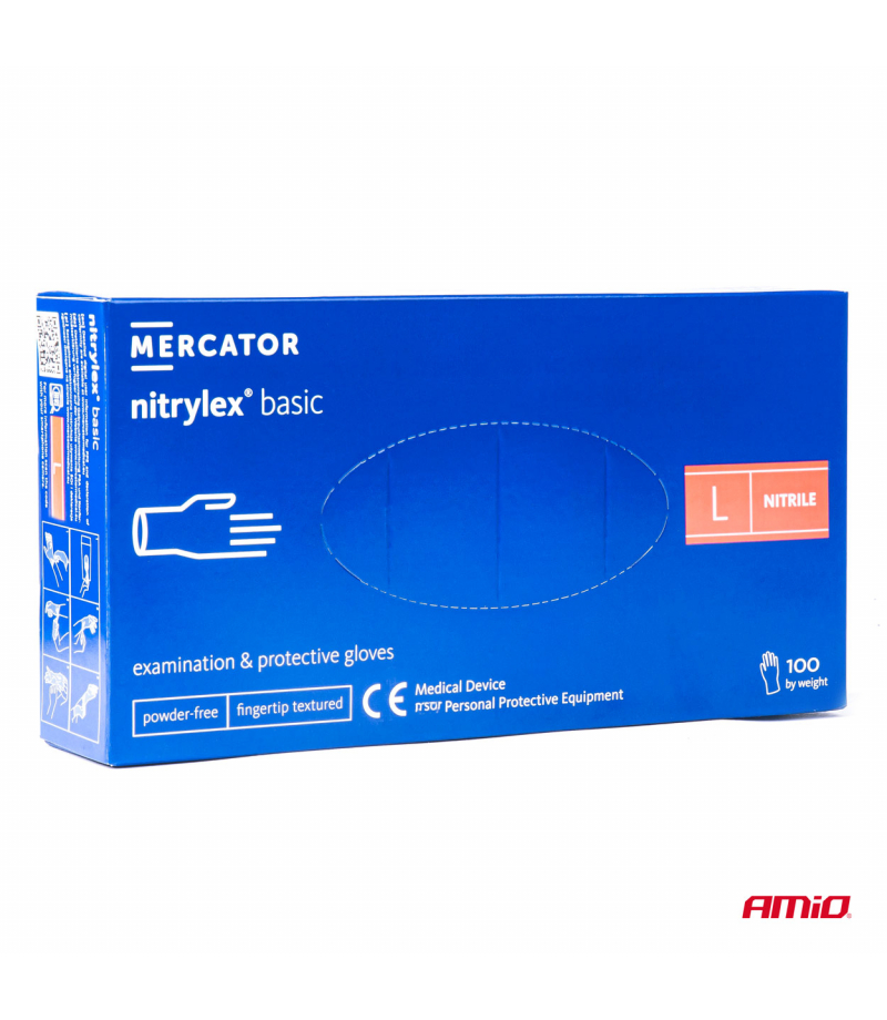 Rękawice nitrylowe niebieskie Mercator Nitrylex Basic rozmiar L 100 szt. Nitrylex Basic to bezpudrowe rękawice nitrylowe - 100 sztuk w opakowaniu. Posiadają właściwości antystatyczne. Szerokość rozmiaru S: 80mm Szerokość rozmiaru M: 95mm Szerokość rozmiaru L: 110mm Szerokość rozmiaru XL: ≥110mm Diagnostyczne i ochronne rekawice nitrylowe o podstawowym zastosowaniu. Opakowanie z materiału jednorodnego, nadaje sie w 100% do...
