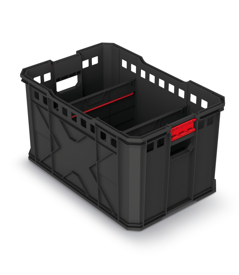 Kosz narzędziowy posiada 2 wyjmowane przegrody do aranżacji przestrzeni wewnętrznej i możliwość łączenia oraz piętrowania z innymi elementami systemu X BLOCK. Otwory w górnej części zapewniają wentylację np. dla mokrych wałków, jeśli na kosz zapięta jest walizka lub skrzynia serii X BLOCK.