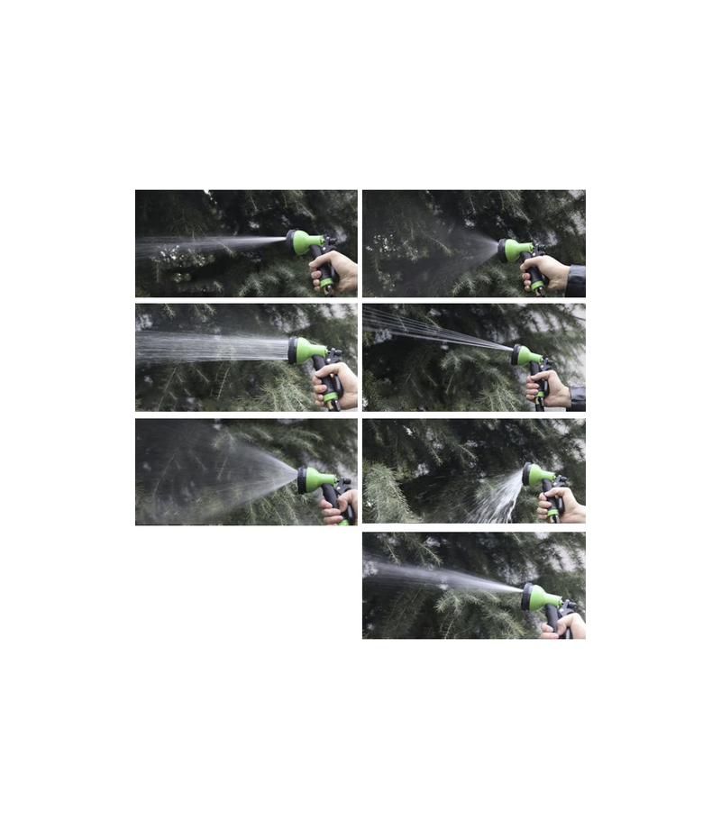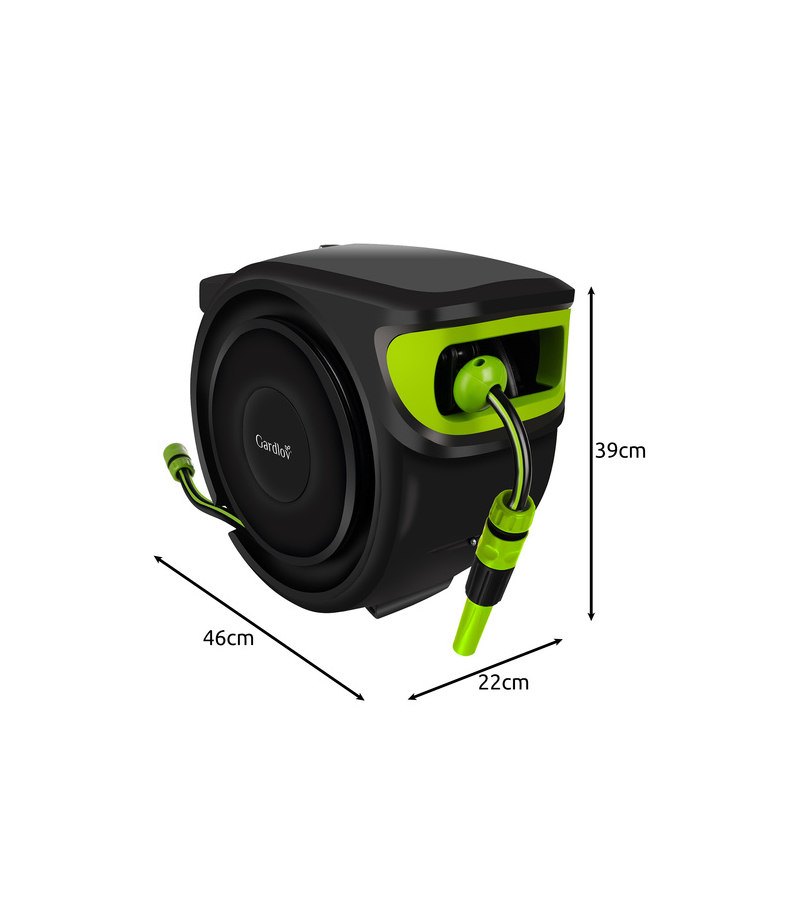kompletny zestaw do podlewania – otrzymujesz wszystko, czego potrzebujesz: automatyczny zwijacz, 25 m węża, pistolet 7-funkcyjny, końcówki, przyłącza, uchwyt ścienny z obrotem 180°, a nawet 2-metrowy wąż doprowadzający