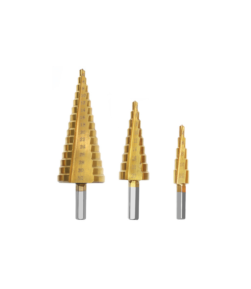 ZESTAW WIERTEŁ STOŻKOWYCH - 3 SZTUKI STAL ŁOŻYSKOWA POKRYTA TYTANEM - wiertła są wytrzymałe, wykonane są z szybkotnącej, odpornej i wytrzymałej stali łożyskowej pokrytej tytanem, dzięki czemu doskonale sprawdzą się przy wierceniu otworów np. w PVC, blachach cienkościennych, a nawet w metalu. Produkt nie wymaga wcześniejszego nawiercenia. CZYTELNA NUMERACJA – wiertła są stopniowane, na każdym z nich znajduje się numeracja. Jest ona doskonale czytelna, dzięki czemu...