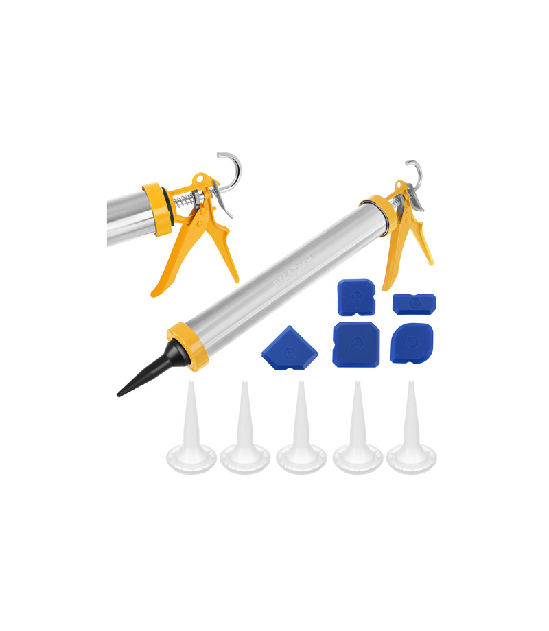 Wyciskacz pistolet do silikonu 600 ml Bigstren do kartuszy i kiełbasy + 5 dysz + 5 szpatułek Masz dość nierównych spoin, zacieków i męczącego dozowania silikonu Wyciskacz Bigstren 600 ml pozwala aplikować masę płynnie i precyzyjnie, a dołączone dysze i szpatułki pomagają od razu uzyskać estetyczne wykończenie . To wygodne narzędzie do uszczelnień w domu i w pracy. Najważniejsze zalety pistoletu do mas BIGSTREN do aplikacji silikonu i mas uszczelniających - pasuje do opakowań typu kartusz oraz kiełbasa solidna tuba ze stopu aluminium - większa trwałość i stabilna praca przy intensywnym użytkowaniu płynne wyciskanie - mniej siły potrzebnej do pracy, bez szarpania, zacięć i nieprzyjemnego oporu ergonomiczny spust - mniej zmęczenia dłoni i łatwiejsze dozowanie masy pojemność 600 ml - żadsze wymiany wkładu i szybsza realizacja dłuższych spoin 5 wymiennych dysz - dopasujesz szerokość i kształt spoiny do konkretnego miejsca 5 szpatułek do fug w różnych kształtach - wygładzisz fugę na czysto zaraz po nałożeniu... Więcej szczegółów