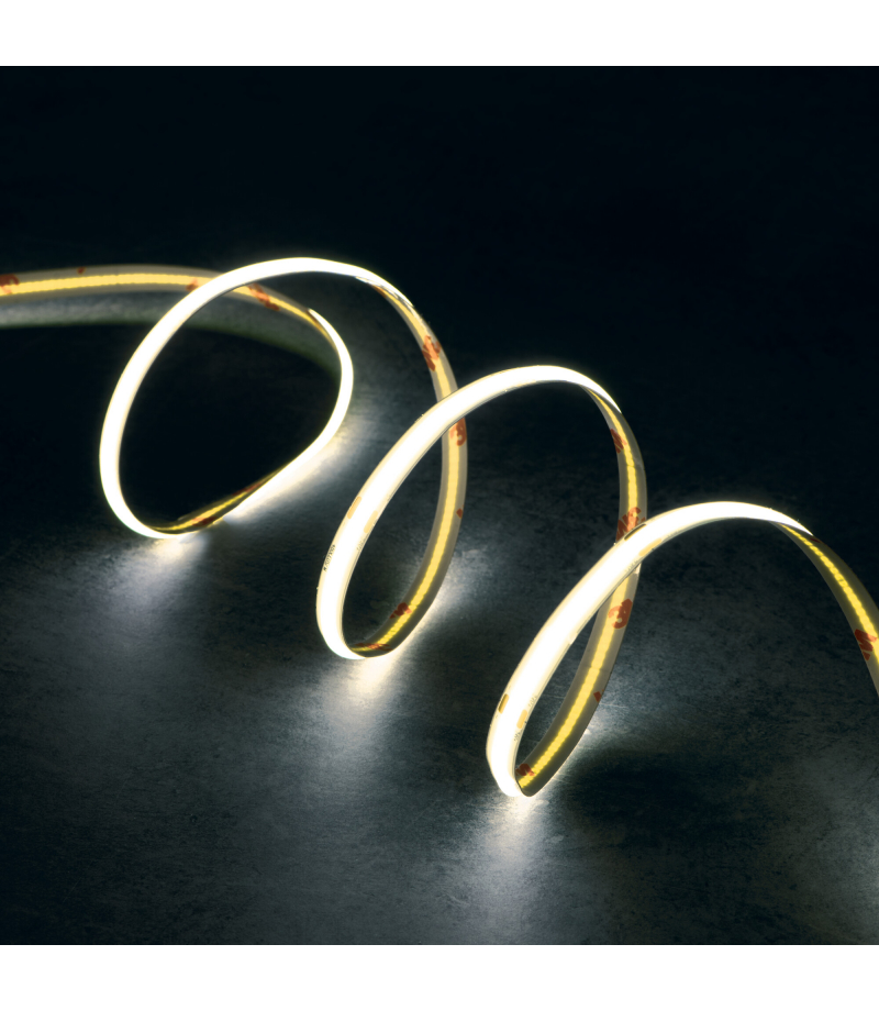 Kanlux LCOB LONG to taśmy LED stworzone z myślą o długich, jednolitych liniach świetlnych bez widocznego osłabienia jasności na końcach. Dzięki specjalnemu układowi stabilizującemu, możliwe jest zasilanie nawet 20-metrowych odcinków bez utraty jakości światła, co w przypadku klasycznych taśm LED stanowi ogromne wyzwanie. Gęsto rozmieszczone diody (480 LED/m) i technologia COB zapewniają jednolitą linię światła o wysokiej skuteczności (do 690 lm/m) i bardzo dobrej jakości odwzorowania barw (CRI 90). Taśmy dostępne są w trzech barwach światła: ciepłej 3000K, neutralnej 4000K i zimnej 6500K, co pozwala na ich dopasowanie do różnych przestrzeni i potrzeb. Elastyczność montażu, cięcie co 50 mm, rolki 20 m i napięcie 24V czynią z Kanlux LCOB LONG idealne rozwiązanie do realizacji długich, estetycznych i bezproblemowych instalacji liniowych.