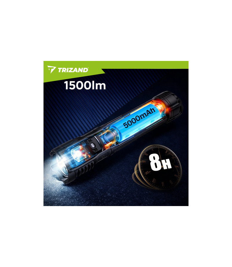 Gdy robi się ciemno, zwykła latarka często daje zbyt słabe światło i szybko się rozładowuje. Trizand to mocna latarka taktyczna 1500 lm z akumulatorem 5000 mAh, zoomem i 5 trybami świecenia, dzięki czemu masz pewne oświetlenie w domu, samochodzie i w terenie.