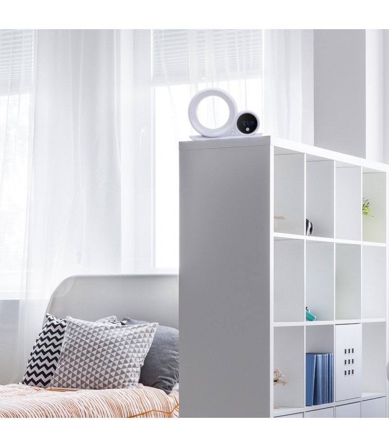 Lampa stołowa Rabalux Wakeway jest polecana dla osób, które szukają dekoracyjnej lampy uzupełniającej, łączącej wiele funkcji. Istotą tego modelu są dwa okrągłe elementy lampy o różnych rozmiarach, trzymane przez wydłużoną, płaską dekoracyjną podstawę. Mniejszy element jest wyposażony w wyświetlacz pokazujący godzinę oraz wbudowany głośnik Bluetooth, podczas gdy większy element pełni funkcję lampy. Impedancja głośnika wynosi 4 Ω, moc: 3 W. Lampa stołowa emituje światło z wewnętrznej połowy pierścieniowego korpusu. Ten model oferuje oświetlenie RGB, zapewniając niezwykle nastrojowe, wielokolorowe rozwiązanie świetlne. Lampa designerska jest idealnym wyborem do salonu, sypialni lub pracowni. W zestawie znajduje się kabel oraz wbudowane źródło światła LED, które zapewnia długą żywotność.