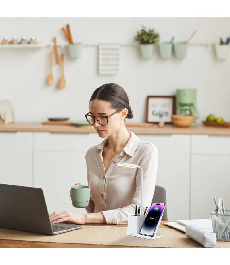 Lampa stołowa Cerie firmy Rábalux jest połączeniem elegancji i funkcjonalności. Lampa jest praktycznym wyposażeniem biurka zarówno w gabinecie, jak i pokoju dziecięcym, ponieważ oprócz zapewnienia oświetlenia niezbędnego do pracy lub nauki, posiada również wbudowany uchwyt na długopis i telefon komórkowy, umożliwiając tym samym utrzymanie porządku na biurku. Uchwyt na telefon umożliwia również bezprzewodowe ładowanie. Biały korpus z tworzywa sztucznego inteligentnej lampy stołowej LED zapewnia świeży i elegancki wygląd. Dzięki zintegrowanej technologii LED ten model charakteryzuje się wyjątkowo energooszczędnym działaniem i długą żywotnością. Istnieje możliwość regulacji w trzech poziomach natężenia światła i temperatury barwowej za pomocą przełącznika dotykowego umieszczonego na kloszu. Lampa stołowa LED jest dostarczana bez adaptera, z kablem typu C.
