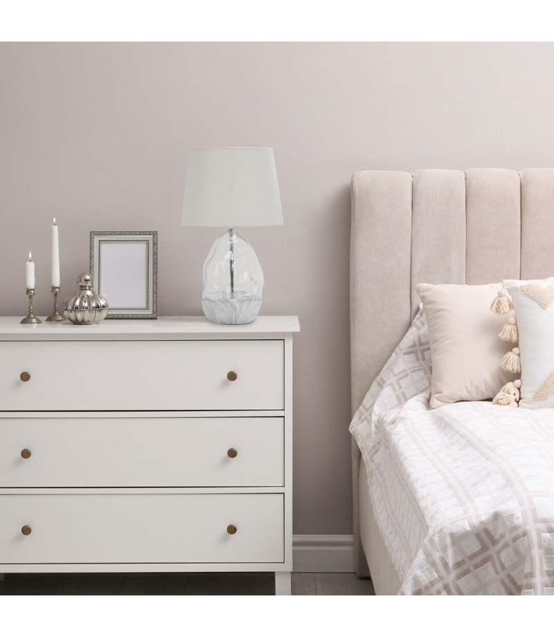 Lampa stołowa Rabalux Apolonia jest polecana dla osób, które szukają wyjątkowej, przyciągającej wzrok lampy uzupełniającej. Ta lampa designerska ma korpus wykonany z przezroczystego szkła i białej ceramiki oraz biały tekstylny abażur. Abażur lekko rozszerza się ku dołowi, a jego kolor światła filtruje, ale nie tłumi nadmiernie światła emitowanego przez żarówkę. Lampa stołowa jest idealnym wyborem do salonu lub sypialni, gdzie może również pełnić rolę elementu dekoracyjnego. W zależności od preferencji, można wybrać żarówkę emitującą ciepłe lub naturalne białe światło. Lampa jest obsługiwana za pomocą przełącznika na kablu i może być używana z jedną żarówką o mocy do 40 W. Typ gniazda to E27. Lampka nocna jest dostarczana bez źródła światła.