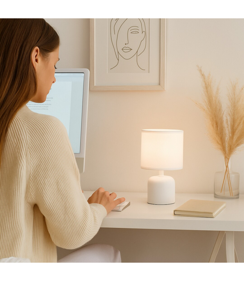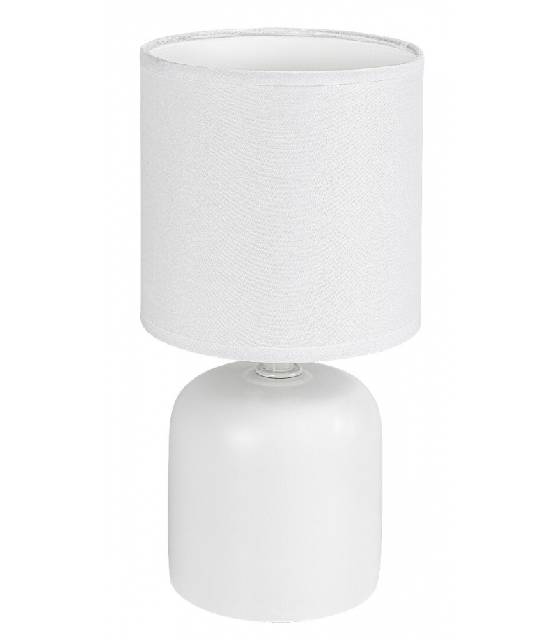 Lampa stołowa Rabalux Daphni polecana jest osobom poszukującym niewielkiej, eleganckiej lampy uzupełniającej do salonu lub sypialni. Ten model o czystej formie można ustawić na stoliku nocnym, małym stoliku lub nawet na półce. Posiada cylindryczną oprawę wykonaną z białej ceramiki, a klosz zrobiony jest z białej tkaniny. Abażur ma kształt cylindra i jest otwarty u góry i u dołu. Dzięki kolorystyce i formie model ten przepuszcza stosunkowo dużo światła, dlatego nadaje się również do czytania. Lampa stołowa może być używana z jedną żarówką o mocy do 40 W. Typ trzonka: E14. Można wybrać źródło światła emitujące ciepłe lub naturalne białe światło. Ceramiczna lampka nocna obsługiwana jest za pomocą wyłącznika na kablu. Dostarczana jest bez źródła światła.