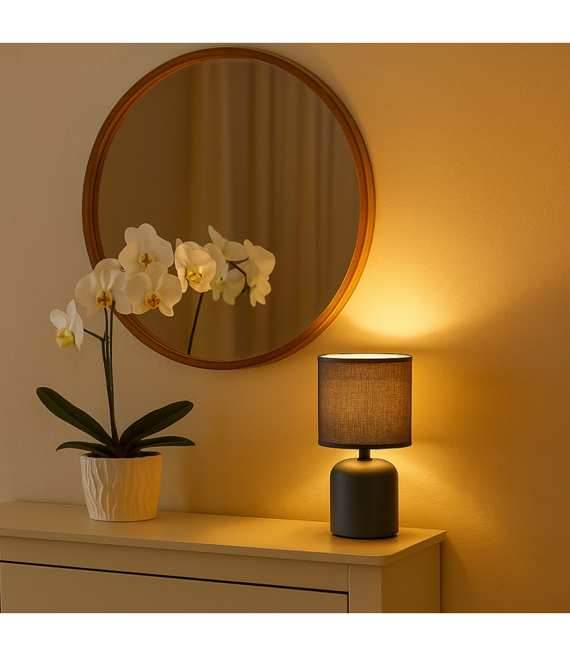 Lampa stołowa Rabalux Daphni polecana jest osobom poszukującym niewielkiej, eleganckiej lampy uzupełniającej do salonu lub sypialni. Ten model o czystym, prostym designie można ustawić na stoliku nocnym, małym stoliku lub nawet na półce. Cylindryczna oprawa wykonana jest z modnej niebieskiej ceramiki, a abażur z tkaniny w tym samym kolorze. Abażur ma kształt cylindra i jest otwarty u góry i u dołu. Dzięki ciemnej kolorystyce lampa tworzy subtelne, miękko rozproszone światło i nastrojowe oświetlenie. Może być używana z jedną żarówką o mocy do 40 W. Typ trzonka: E14. W zależności od gustu można wybrać źródło światła emitujące ciepłe lub naturalne białe światło. Ceramiczna lampka stołowa wyposażona jest w wyłącznik na kablu. Dostarczana jest bez źródła światła.