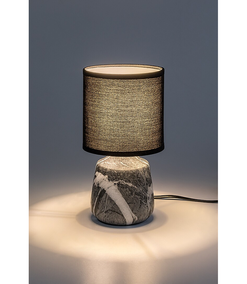 Lampa stołowa Rabalux Nalisa polecana jest osobom, które lubią lampy o naturalnym efekcie i harmonijnym wyglądzie. Ta nowoczesna lampka nocna posiada cylindryczną ceramiczną oprawę w szaro-białym marmurowym wzorze, uzupełnioną czarnym, cylindrycznym abażurem tekstylnym otwartym u góry i u dołu. To doskonały wybór do sypialni lub salonu – można ją ustawić na stoliku nocnym lub na stole. Ciemny abażur zapewnia dyskretne oświetlenie, dzięki czemu lampa sprawdzi się idealnie wtedy, gdy potrzebujesz światła w nocy, ale nie chcesz obudzić partnera. Może być używana z jedną żarówką o mocy do 40 W. Typ trzonka: E14. Ceramiczna lampka nocna wyposażona jest w czarny przewód oraz wyłącznik na kablu. Dostarczana jest bez źródła światła.