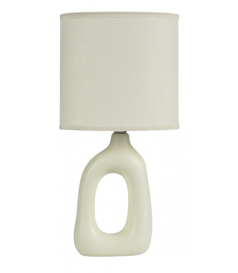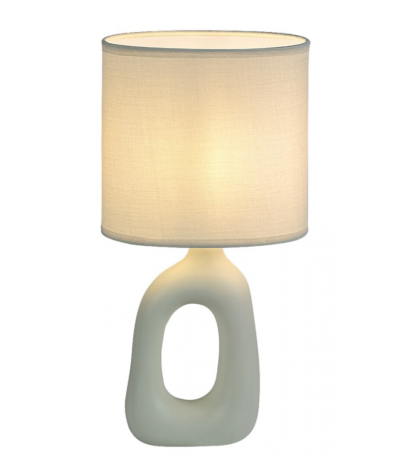 Lampa stołowa Rabalux Sylira polecana jest osobom poszukującym lampy uzupełniającej o unikalnym designie do salonu lub sypialni. Ta nowoczesna lampka nocna charakteryzuje się oprawą z otworem pośrodku, wykonaną z białej ceramiki. Abażur ma kształt cylindra, jest otwarty u góry i u dołu, i wykonany z białej tkaniny. Lampa stołowa może być używana z jedną żarówką o mocy do 40 W. Typ trzonka: E14. W zależności od gustu można wybrać źródło światła emitujące ciepłe lub naturalne białe światło. Jeśli lampa zostanie umieszczona w sypialni, warto zastosować żarówkę emitującą ciepłe białe światło, aby stworzyć relaksującą atmosferę. Można ją postawić na stoliku nocnym lub dowolnym innym stole. Lampka nocna jest wyposażona w wyłącznik na kablu. Dostarczana jest bez źródła światła.