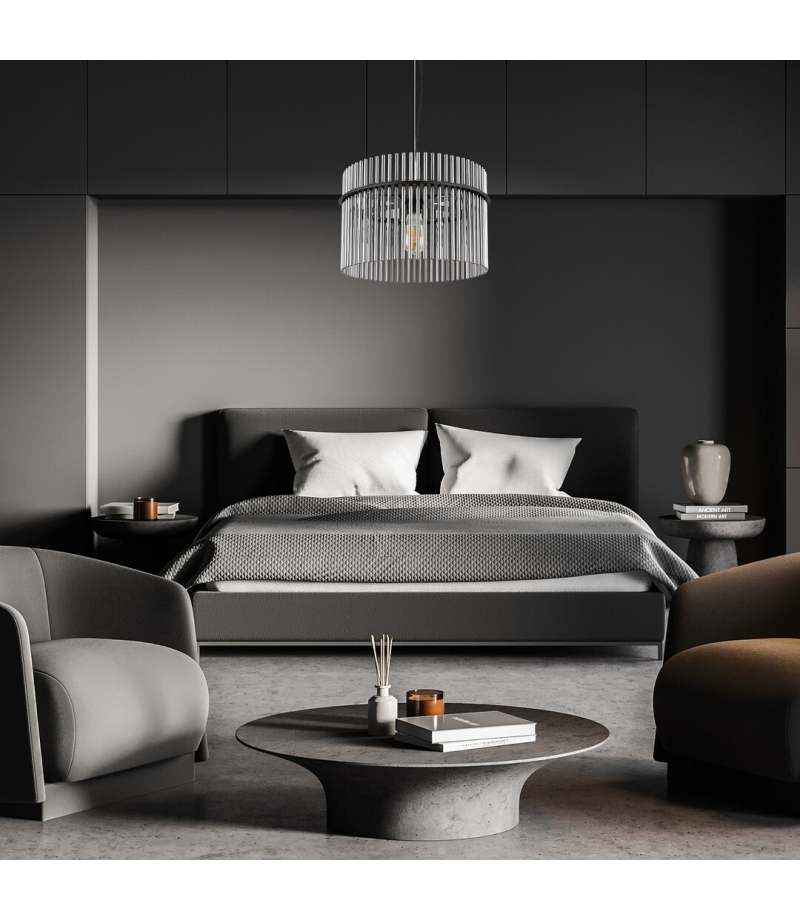 Wykonana w stylu nowoczesnym oprawa wisząca Inesa jest eleganckim wyborem do salonu, jadalni lub sypialni. Wykonana z metalu oprawa w kolorze czarnym matowym jest uzupełniona szklanym kloszem i może być przymocowana do sufitu za pomocą małej, okrągłej podstawy dekoracyjnej. Cienkie, cylindryczne elementy tworzące klosz przypominają miniaturowe piszczałki organowe i otaczają źródło światła niczym kurtyna. Do oprawy Inesa można zastosować źródło światła z trzonkiem E27, o mocy max. 40 W. Ponieważ przez przezroczysty klosz źródło światła jest dobrze widoczne, warto zastosować niestandardową, estetyczną żarówkę dekoracyjną. Jeśli użytkownik chce zamontować oprawę w sypialni, polecamy zastosowanie źródło światła o ciepłej barwie. Takie światło jest relaksujące dla oczu, jest idealne do wypoczynku i wspomaga utworzenie miłej, przytulnej atmosfery. Wymiary oprawy wiszącej Inesa są następujące: średnica 400 mm, wysokość klosza 260 mm, zwis regulowany w zakresie od 1000 do 1500 mm, średnica otworu montażowego 120 mm. Model ten jest dostarczany bez źródła światła.