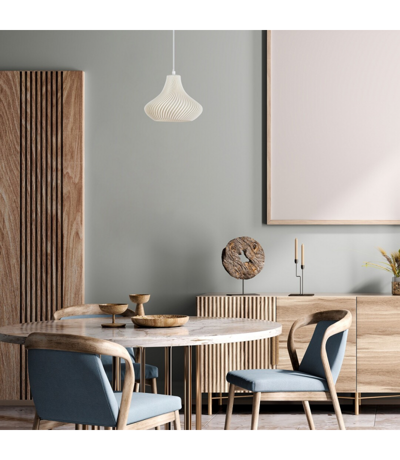 Wyglądająca świeżo i elegancko, wykonana w nowoczesnym stylu oprawa wisząca Tiana jest doskonałym wyborem zarówno do salonu, jak i do jadalni lub sypialni. Wykonana z metalu oprawa w kolorze chromu jest uzupełniona białym kloszem z tworzywa sztucznego i może być przymocowana do sufitu za pomocą małej, okrągłej podstawy dekoracyjnej. Skręcony klosz w kształcie figi nadaje tej oprawie wiszącej wyjątkowy wygląd. Do oprawy Tiana można zastosować źródło światła z trzonkiem E14, o mocy max. 25 W. Użytkownik może wybrać temperaturę barwową źródła światła według własnych upodobań: jeśli oprawa będzie używana w sypialni, najlepiej jest użyć źródło o ciepłej barwie, ponieważ ten rodzaj światła pomaga stworzyć przytulną, miłą atmosferę, jest relaksujący dla oczu i idealny do relaksu. Wymiary oprawy wiszącej Tiana są następujące: średnica 220 mm, zwis 1200 mm, średnica otworu montażowego 90 mm. Model ten jest dostarczany bez źródła światła.