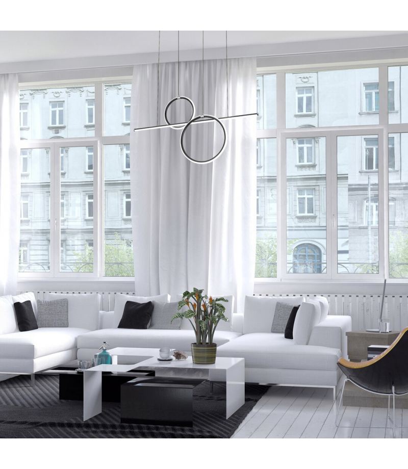 Nowoczesna lampa wisząca Willow z 3 żarówkami jest doskonałym wyborem do salonu. jadalni lub sypialni dzięki swojemu wyjątkowemu wzornictwu. Metalowa oprawa w kolorze matowej czerni składa się z dwóch elementów w kształcie koła i długiego pręta. a jej uzupełnieniem są chromowane elementy dekoracyjne i białe klosze z tworzywa sztucznego. Poszczególne elementy są zawieszone na różnych wysokościach dzięki linkom przymocowanym do wydłużonej podstawy dekoracyjnej o zaokrąglonych końcach. Willow zawiera wbudowane źródło światła LED o mocy 48 W. strumieniu świetlnym 2760 lumenów i żywotności 20 000 godzin. Dzięki temperaturze barwowej 4000 K żarówki emitują naturalne białe światło. tworząc czysty. nowoczesny efekt. Wymiary lampy wiszącej są następujące: szerokość 1 110 mm. wysokość elementu w kształcie belki - 70 mm. odległość lampy od sufitu - 1 470 mm. Prezentowany model ma 5 lat gwarancji.