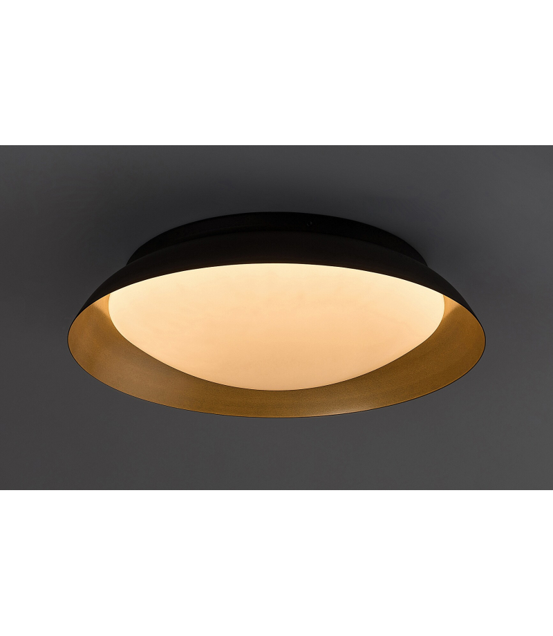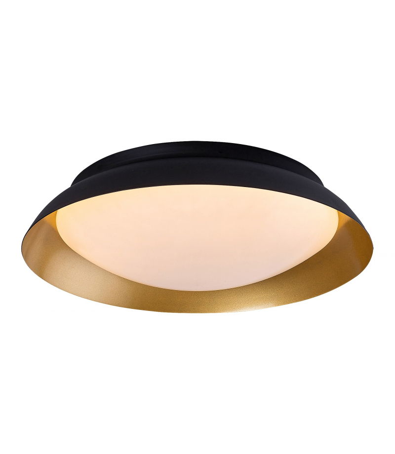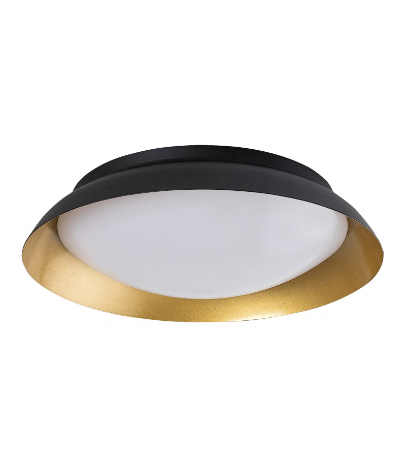 Nowoczesną oprawę sufitową Hafsa polecamy przede wszystkim do salonu lub sypialni. Wykonana w czarno-złotej kolorystyce metalowa oprawa składa się z szerokiego, płaskiego korpusu i białego klosza z tworzywa sztucznego. Dzięki ciepłym kolorom ta elegancka oprawa dobrze pasuje do wnętrz, w których preferuje się powierzchnie i akcesoria wykonane z drewna i innych naturalnych materiałów. Oprawa posiada wbudowane źródło światła LED klasy energetycznej G o mocy 20 W, strumień świetlny z kloszem - 1080 lumenów, bez klosza - 1300 lumenów. Trwałość źródła światła o temperaturze barwowej 3000K jest wyjątkowo wysoka: świeci przez 36.000 godzin! Świecąca światłem o ciepłej barwie oprawa Hafsa stworzy w pomieszczeniu miłą, przytulną atmosferę, idealną do relaksu i przygotowania się do snu. Średnica oprawy sufitowej wynosi 300 mm, a odległość od sufitu 75 mm.
