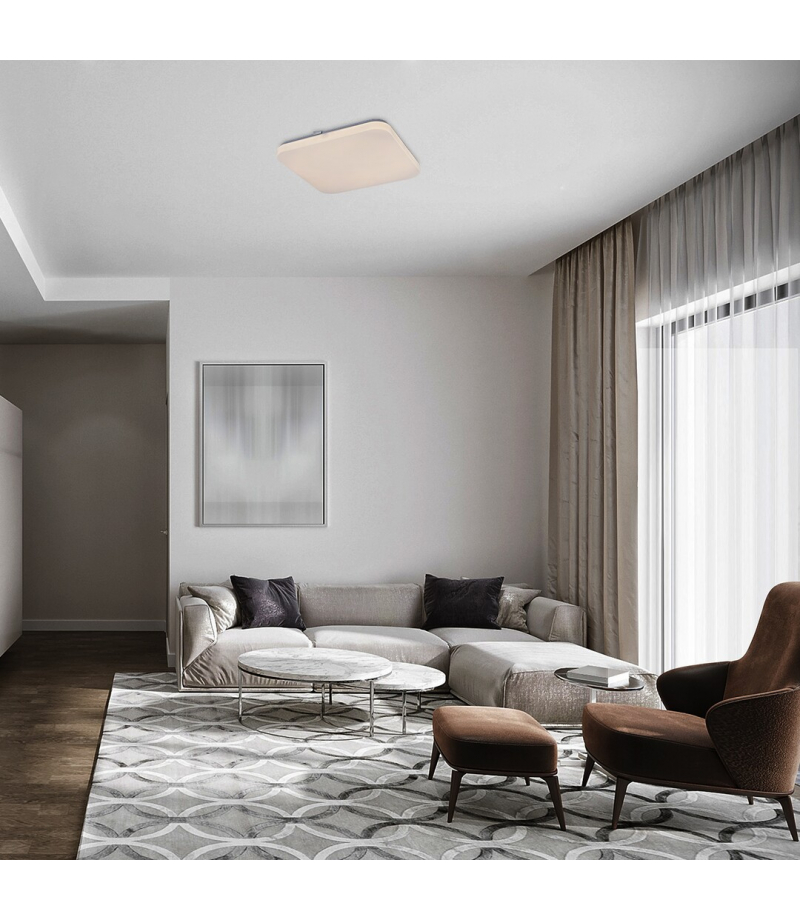 Kwadratowa oprawa sufitowa Vendel charakteryzuje się prostym i klarownym wyglądem, dzięki czemu ten model może być dyskretnym i praktycznym dodatkiem do niemal każdego nowoczesnego salonu lub sypialni. Szukając głównego oświetlenia pokoju, oprawa Vendel może być doskonałym wyborem ze względu na duże rozmiary i duże natężenie światła. Biała oprawa wykonana z metalu jest uzupełniona białym kloszem z tworzywa sztucznego, kanciaste kształty oprawy są złagodzone zaokrąglonymi narożnikami. Oprawa Vendel posiada wbudowane źródło światła LED klasy energetycznej G o mocy 18 W, strumieniu świetlnym z kloszem - 1350 lumenów, bez klosza - 1800 lumenów. Trwałość źródła światła jest fantastyczna: 50.000 godzin! Źródło światła o temperaturze barwowej 3000 K emituje ciepłobiałe światło, dlatego ta lampa sufitowa jest szczególnie dobrym wyborem do sypialni, gdzie może wesprzeć stworzenie przytulnej, domowej atmosfery przed snem. Oprawa sufitowa Vendel ma wymiary 320x320 mm, a odległość od sufitu wynosi zaledwie 60 mm.