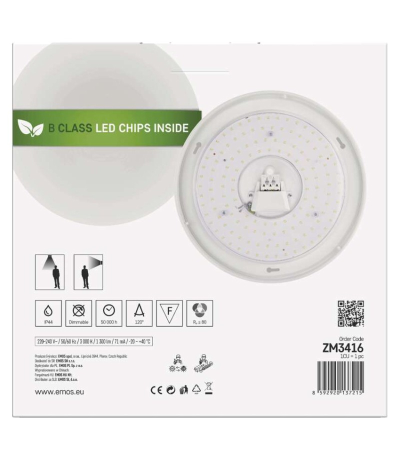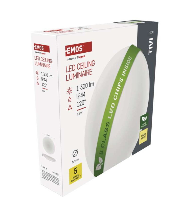 Oprawa sufitowa LED TIVI, B CLASS, okrągła biała 8,6W, IP44, ciepła biel EMOS ZM3416 Barwa światła: ciepła biel Częstotliwość: 50/60 Hz Czujnik ruchu: nie Do biura: tak Do kuchni: tak Do łazienki: tak Do ogrodu i na balkon: tak Do salonu, sypialni i pokoju dziecięcego:...
