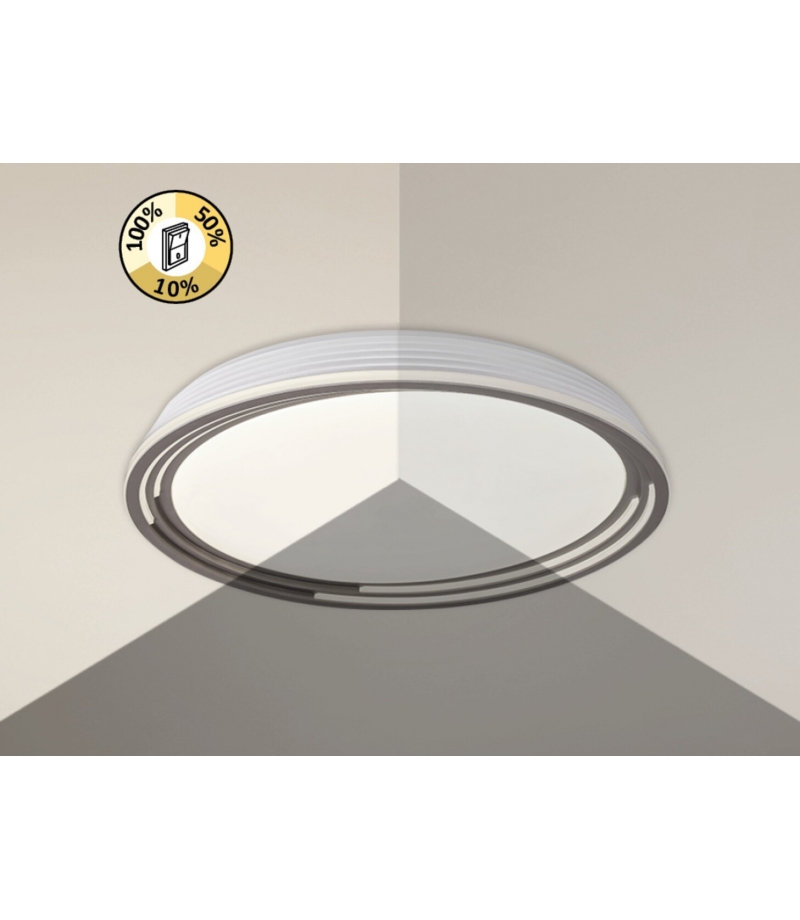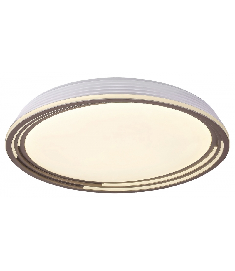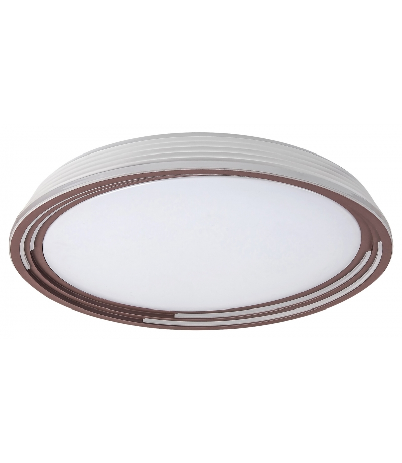 Dzięki swojemu powściągliwemu designowi i wysokiej jasności, duża, okrągła lampa sufitowa Valter będzie doskonałym wyborem do niemal każdego nowoczesnego salonu, sypialni lub gabinetu. Ten model składający się z brązowej metalowej oprawy i białego klosza z tworzywa sztucznego dyskretnie wtopi się w jasny kolor sufitu. Lampa Valter ma wbudowane energooszczędne źródło światła LED o mocy 36W, strumieniu świetlnym 2250 lumenów i żywotności 30 000 godzin. Temperatura barwowa inteligentnej żarówki wynosi 3000K i odpowiednio emituje ona ciepłe białe światło, tworząc w pomieszczeniu przytulną, intymną atmosferę. Lampa ta jest ponadto ściemniana, co oznacza, że jej jasność można regulować w 3 stopniach za pomocą przełącznika ściennego. Średnica lampy sufitowej Valter wynosi 515mm, a jej odległość od sufitu to 80mm.