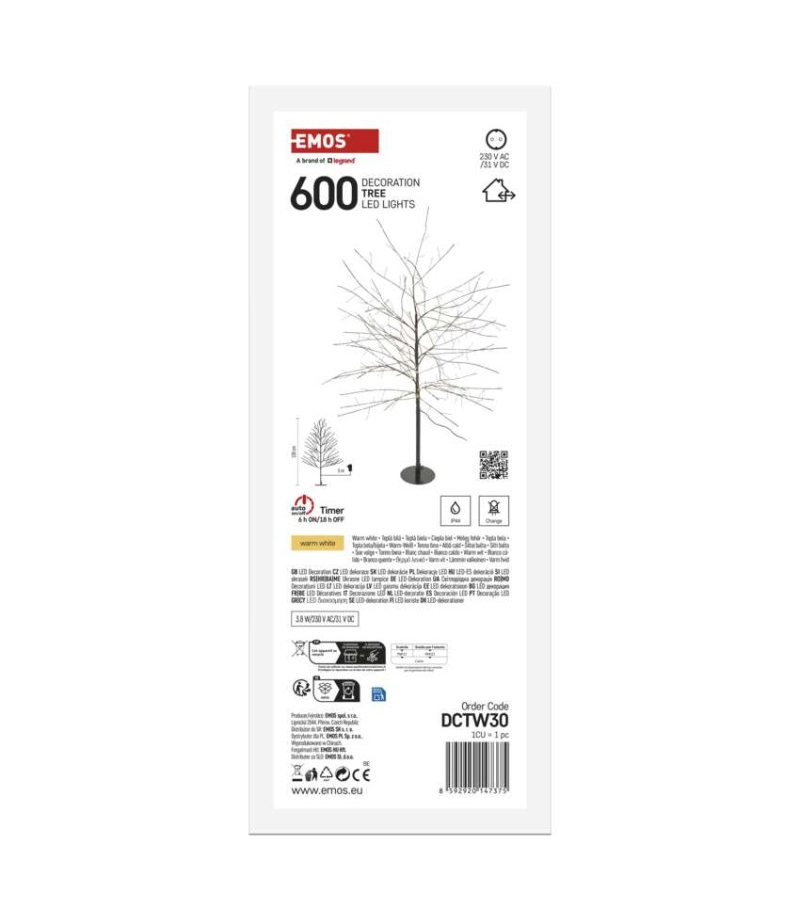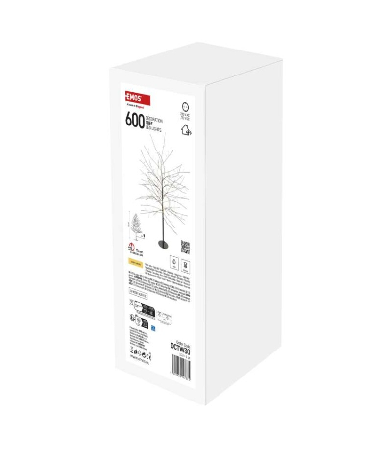 Dekoracje - drzewko 120 cm, ciepła biel, IP44, timer EMOS DCTW30 Barwa światła: ciepła biel Długość przewodu: 5 m Ilość LED: 600 Kolor przewodów: czarny Materiał: metal Moc: 3,8 W Napięcie wejściowe: 230 V AC Napięcie wyjściowe: 31 V DC Okres gwarancyjny: 2 lata Opakowanie: 1 szt., pudełko Pilot zdalnego sterowania: nie Produkt: choinka Stopień ochrony: IP44 Timer: tak Typ zasilania:...