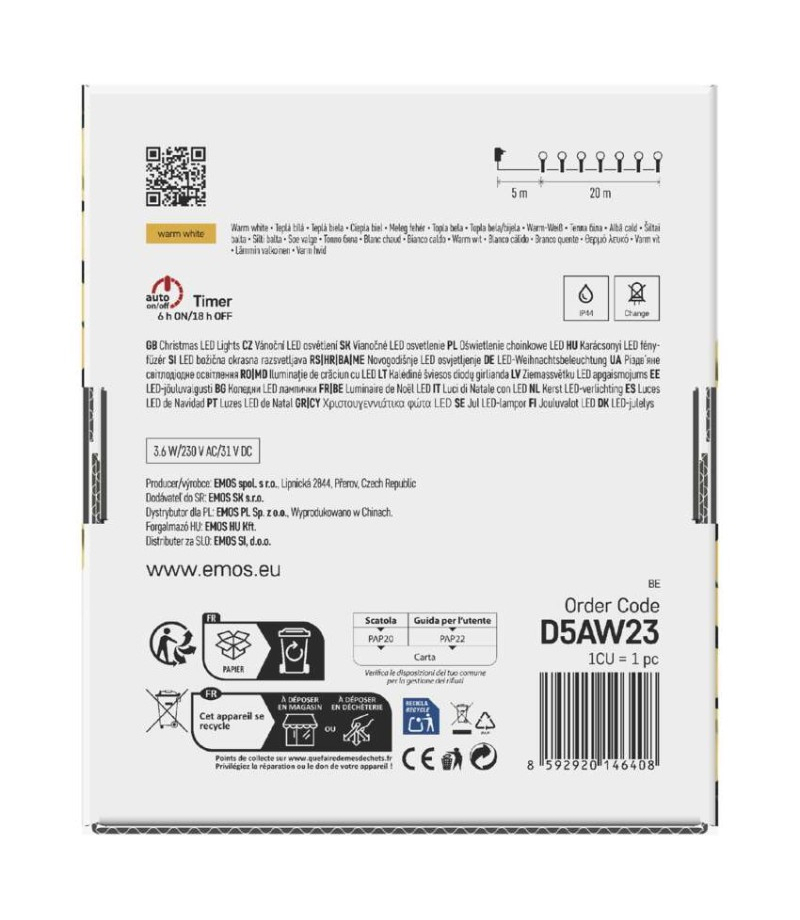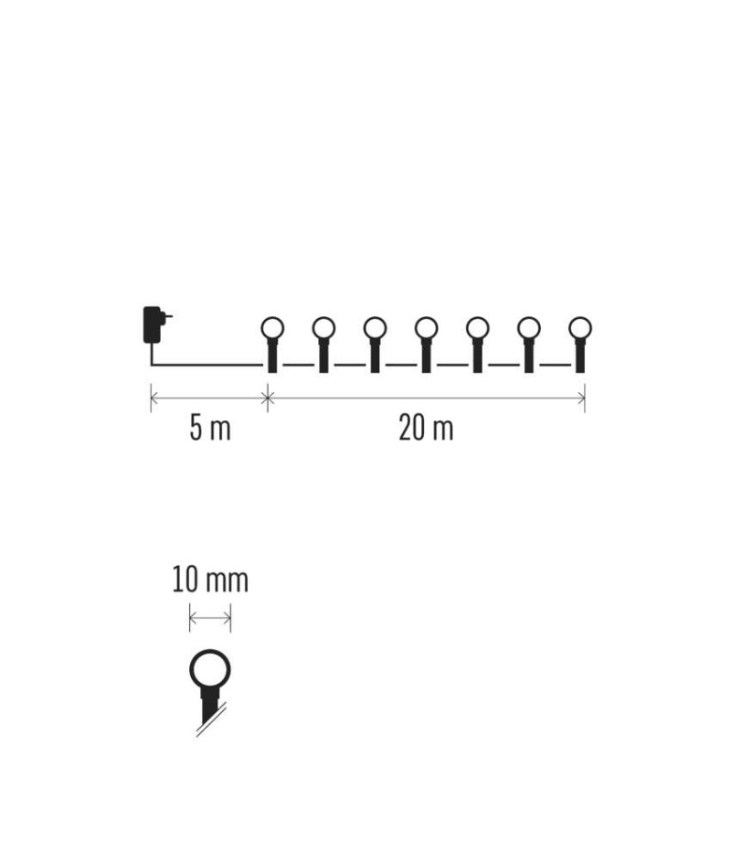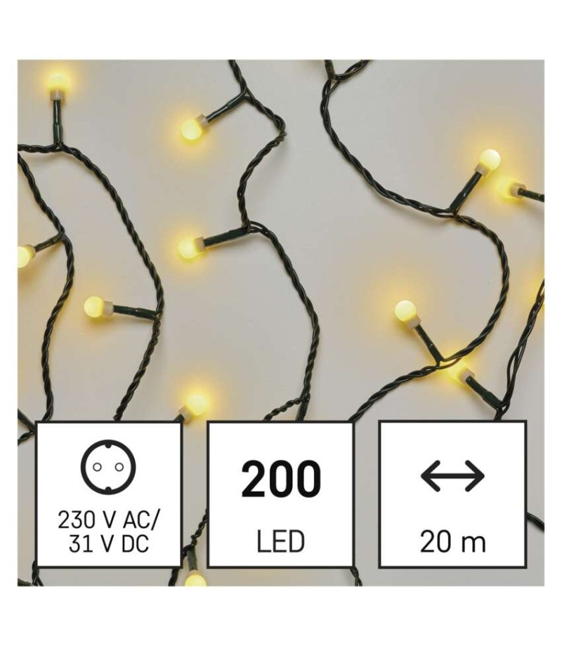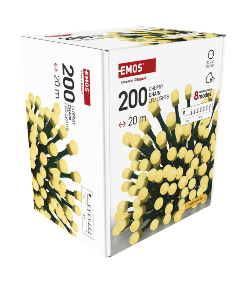 Lampki choinkowe 200 LED cherry 20m , ciepła biel, zielony przewód, IP44,8 programów, time EMOS D5AW23 Barwa światła: ciepła biel Długość przewodu: 5 m Do wysokości choinki: 210 cm Funkcje: 8 trybów (multifunkcja) Ilość LED: 200 Kolor przewodów: zielony Kształt: kulka Materiał: PVC Moc: 3,6 W Możliwość podłączenia: nie Napięcie wejściowe: 230 V AC Napięcie wyjściowe: 31 V DC Odstęp między...