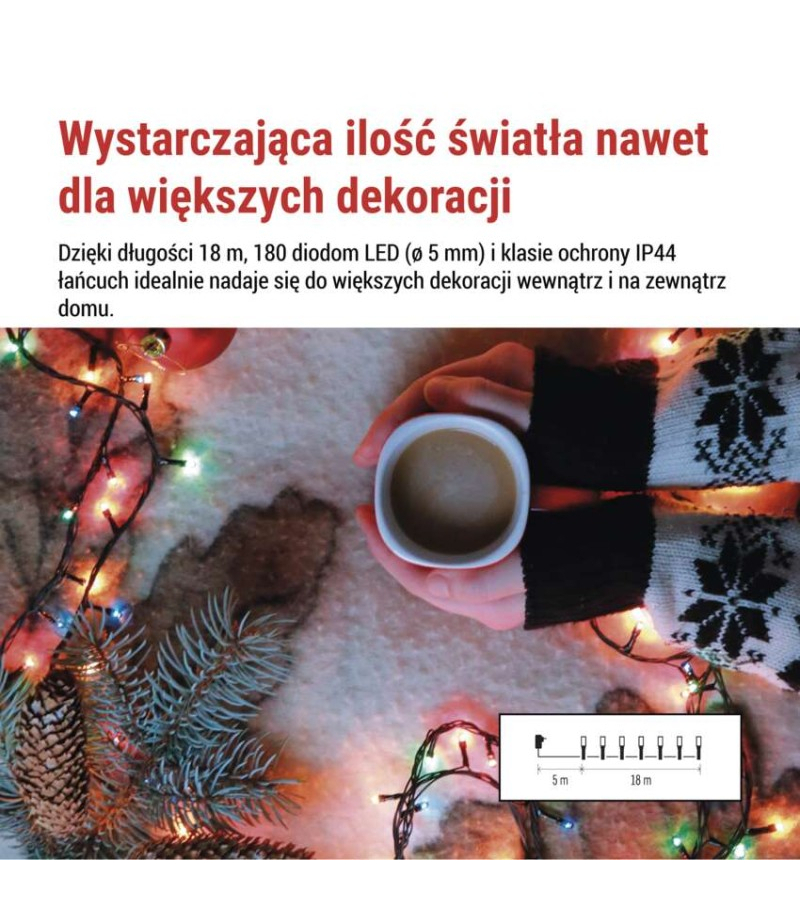 Lampki choinkowe Classic 180 LED 18m multikolor, ziel. przew., IP44, 8 programów, timer EMOS D4AM24 Barwa światła: multicolor Długość przewodu: 5 m Do wysokości choinki: 200 cm Funkcje: 8 trybów (multifunkcja) Ilość LED: 180 Kolor przewodów: zielony Kształt: klasyczny...