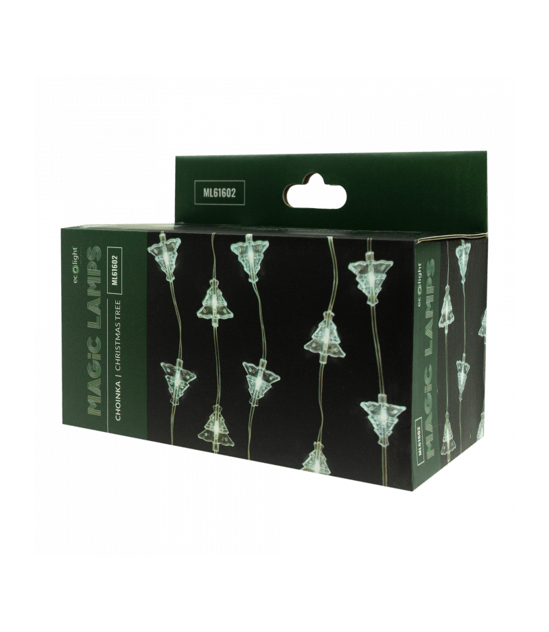 Girlanda 5 m z 50 diodami LED w chłodnej barwie 6500K i motywem choinki podkreśli dekoracje choinkowe, okna i półki.