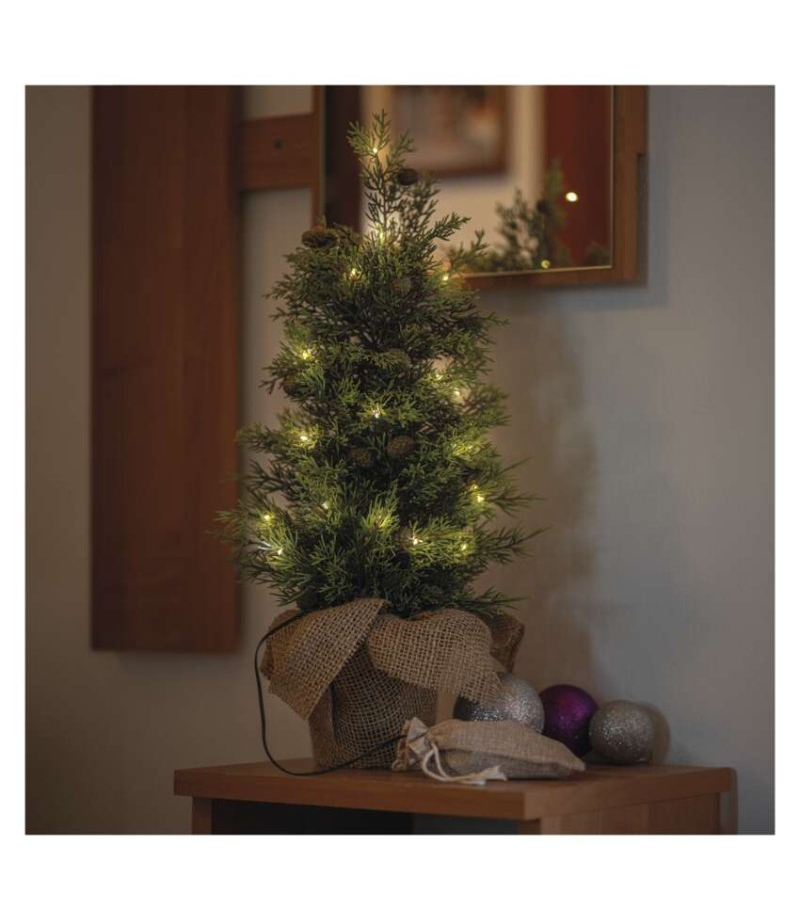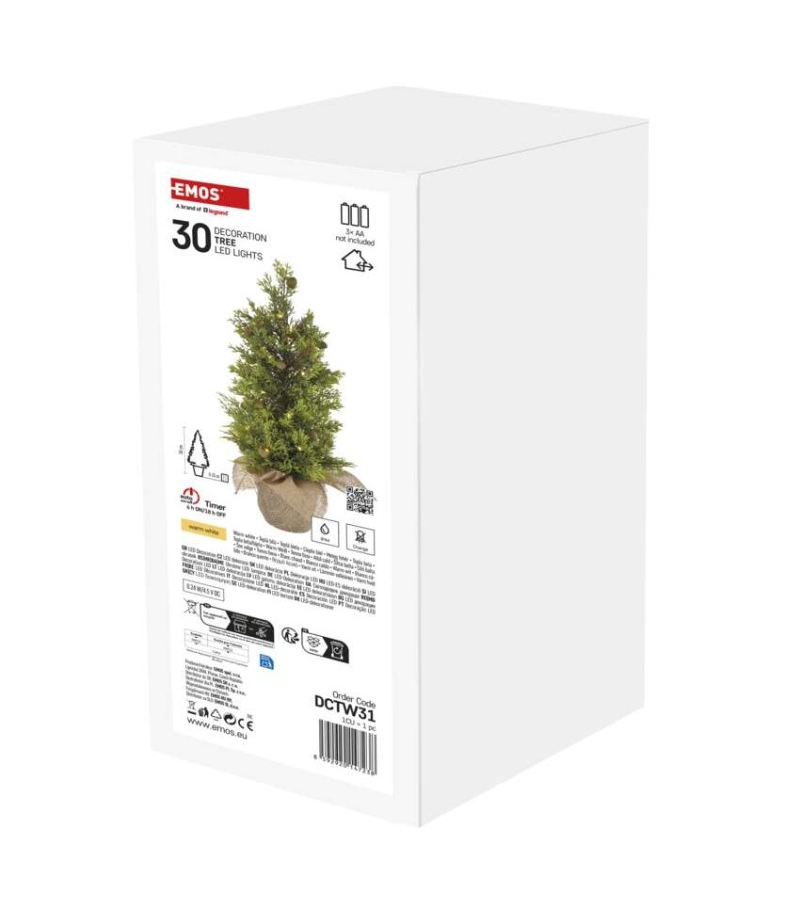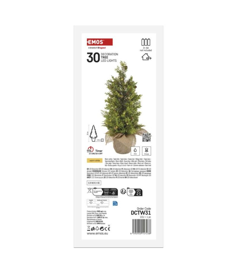 Dekoracje - choinka 30 LED, 50 cm, ciepła biel, IP44, timer EMOS DCTW31 Barwa światła: ciepła biel Długość przewodu: 15 cm Ilość LED: 30 Kolor przewodów: czarny Materiał: tworzywo Moc: 0,24 W Napięcie wyjściowe: 4,5 V DC Okres gwarancyjny: 2 lata Opakowanie: 1 szt., pudełko Pilot zdalnego sterowania: nie Produkt: choinka Stopień ochrony: IP44 Timer: tak Typ zasilania: baterie 3× AA (brak w...