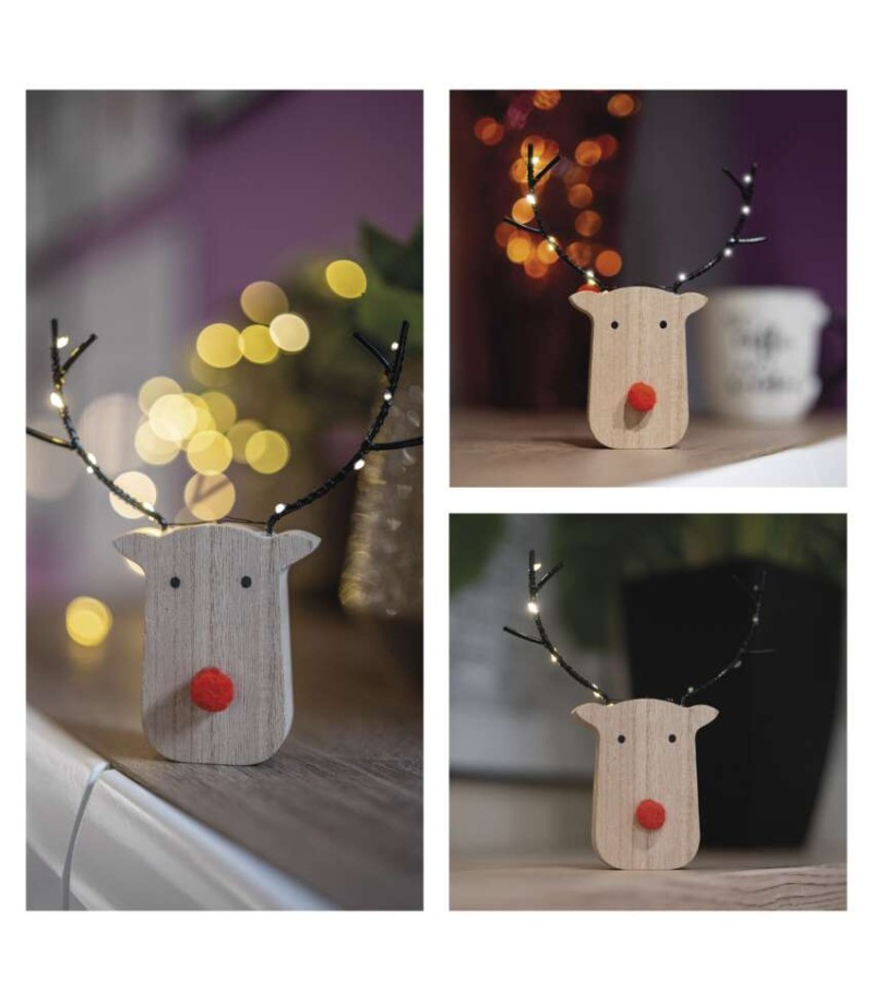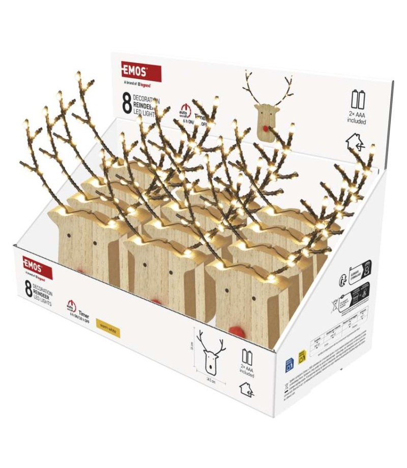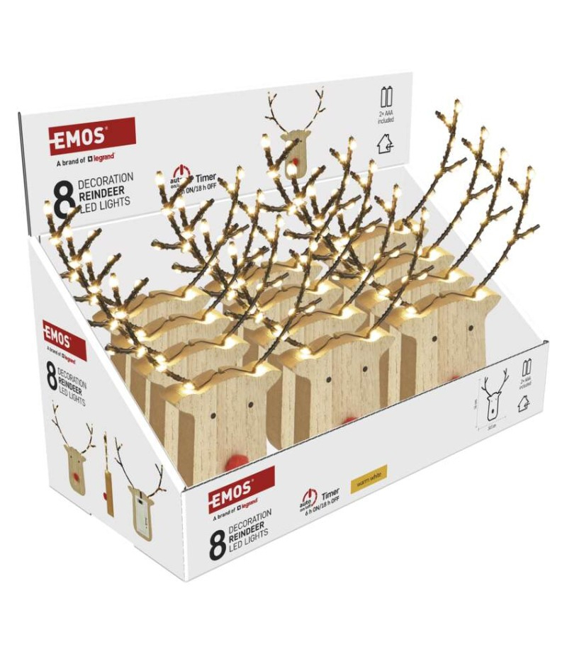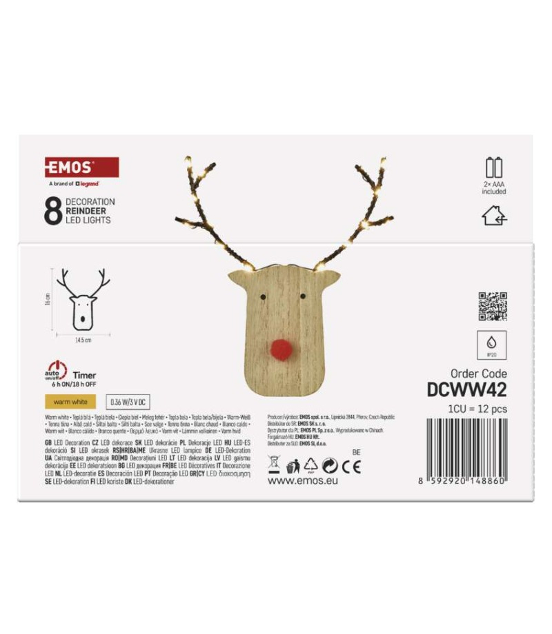 Dekoracje - renifer 8 LED , 16 cm, 2x AAA, ciepła biel, IP20, timer, 12 szt., display box EMOS DCWW42 Barwa światła: ciepła biel Ilość LED: 8 Materiał: drewniany Moc: 0,36 W Napięcie wyjściowe: 3 V DC Okres gwarancyjny: 2 lata Opakowanie: 12 szt., display box Pilot zdalnego sterowania: nie Produkt: renifer Stopień ochrony: IP20 Timer: tak Typ zasilania: baterie 2× AAA (w zestawie) Wymiary: 14,5 ×...