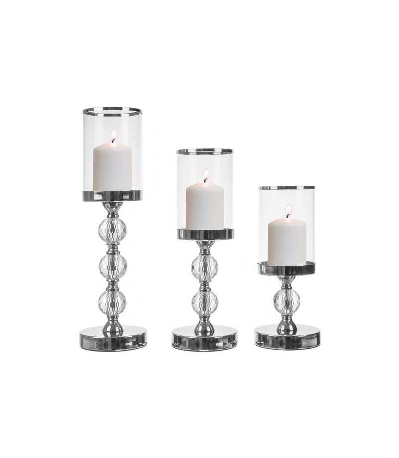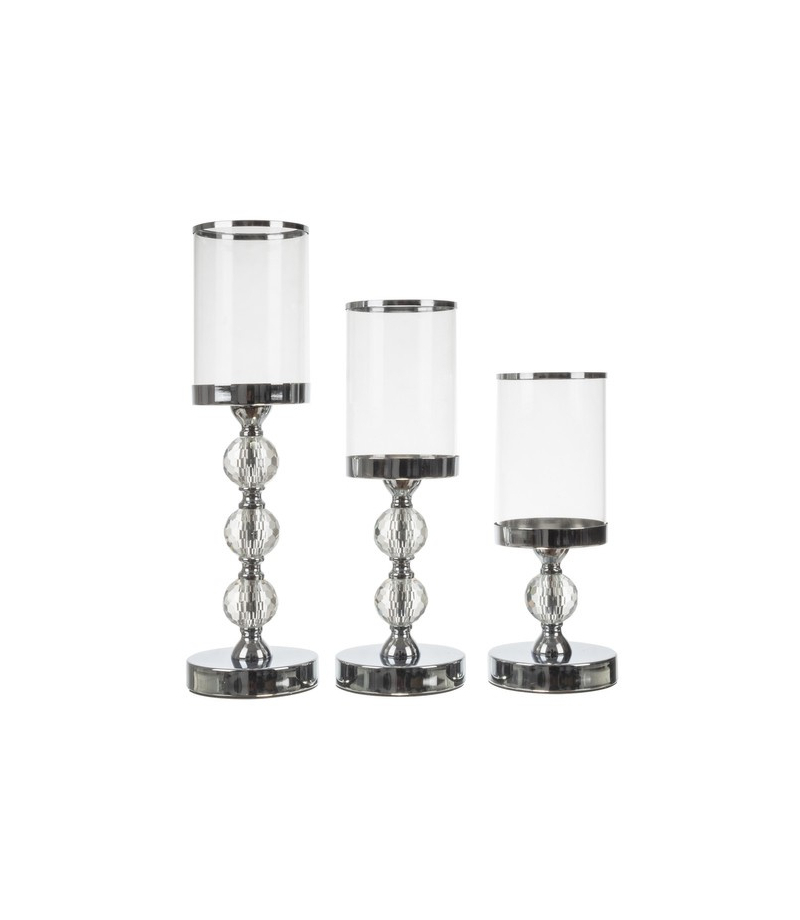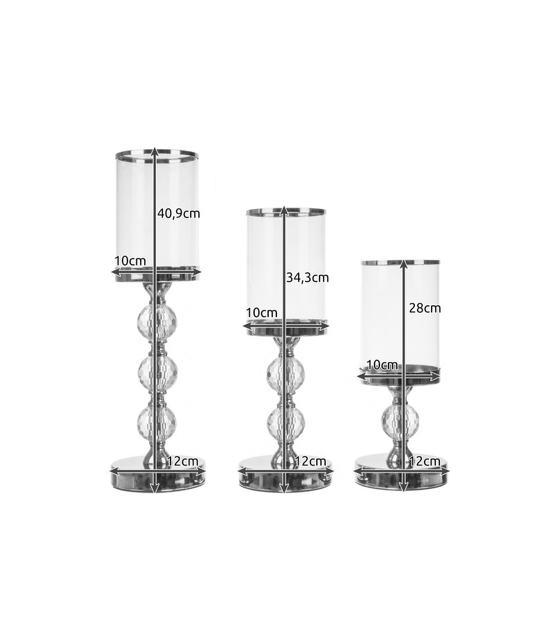 KOMPLET 3 ŚWIECZNIKÓW GLAMOUR 3 RÓŻNE WYSOKOŚCI + KRYSZTAŁOWE DODATKI – świeczniki na nóżce posiadają 3 różne wysokości, każdy z nich posiada ozdobną imitację kryształu na nóżce, w zależności od wysokości mały ma jeden, średni dwa, duży trzy kryształy . DODATKOWY EFEKT - w metalowej wnęce podstawek kloszy, znajdują się lustrzane wkładki, które odbijają padające na nie światło palących się świec, co daje dodatkowy piękny efekt rozświetlenia . ZASTOSOWANIE -...