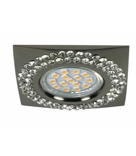Oprawa stropowa wykonana ze stopu aluminiowego, zdobiona kryształkami szklanymi, dostosowana do wymiennych źródeł światła z trzonkiem GU10 zasilanych napięciem sieciowym 230V, idealna do oświetlenia akcentującego jak i tworzenia ciągów oświetleniowych