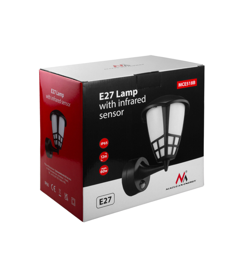 Kinkiet zewnętrzny Maclean MCE518 wyposażony jest w czujnik ruchu na podczerwień oraz czujnik zmierzchu. Dzięki temu zapewnia oświetlenie tylko wtedy, gdy jest to potrzebne, co przekłada się na oszczędność energii i wydłużenie czasu działania źródła światła. Posiada miejsce na jedną żarówkę z gwintem E27 o maksymalnej mocy 60W.