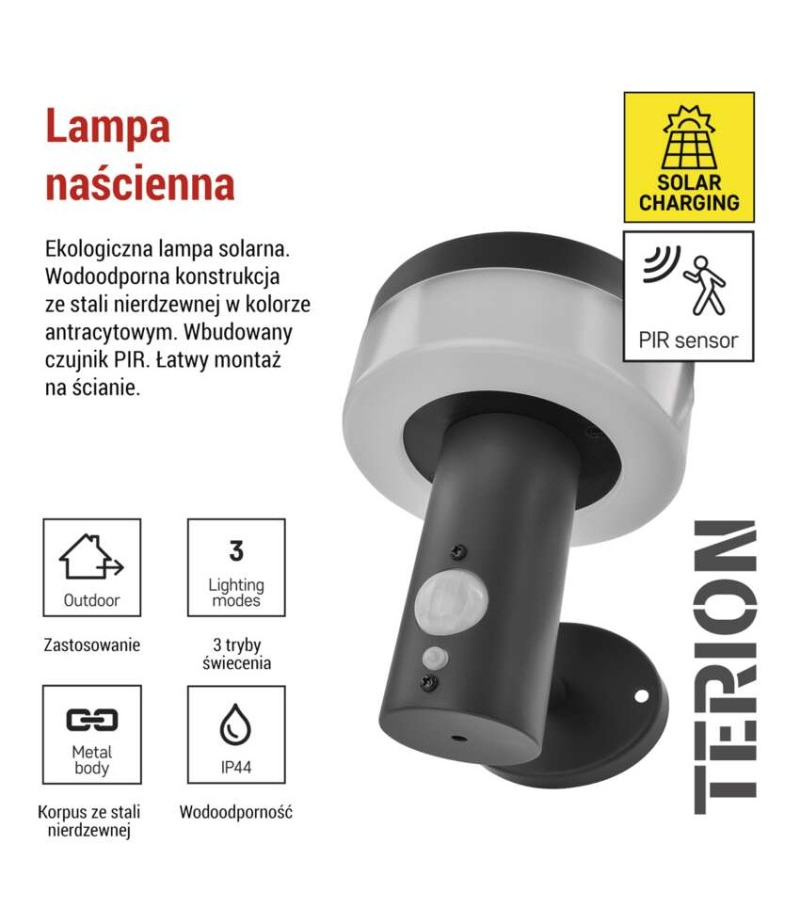 Seria TERION to idealny wybór dla tych, którzy szukają połączenia atrakcyjnego wyglądu i niezawodnej wydajności . Ich nowoczesny design doda wyrazistego charakteru każdej przestrzeni zewnętrznej. W tej serii znajdziesz jedną lampę ścienną i dwa słupki oświetleniowe , wszystkie z wbudowanym czujnikiem PIR . Zapewniają one bezprzewodową pracę bez konieczności podłączania do sieci . Są idealne dla każdego, kto chce mieć pięknie oświetlony ogród z naciskiem na oszczędność i prostotę .