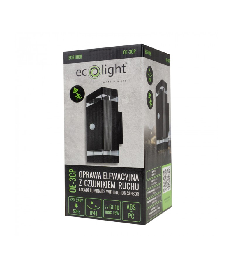 Oprawa elewacyjna plastik OE-3CP 2xGU10 PIR CZARNA Eco Light EC61008 Oprawa elewacyjna plastikowa (symbol dodatkowy 0E-3CP to nowoczesna lampa zewnętrzna, która łączy w sobie funkcjonalność i estetykę. Zaprojektowana z myślą o oświetleniu elewacji budynków, oferuje skuteczne i stylowe rozwiązanie oświetleniowe. Dzięki zastosowaniu trwałych materiałów i przemyślanemu designowi, oprawa ta jest idealna do zastosowań na tarasach, podjazdach, w ogrodach i innych przestrzeniach...