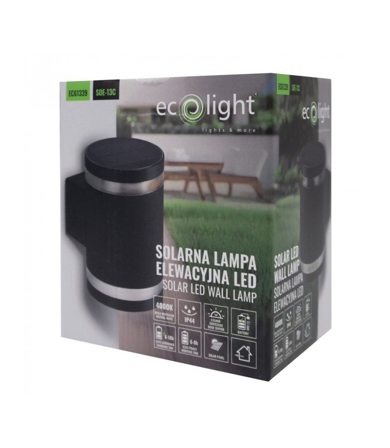 Solarna Oprawa Elewacyjna LED SOE-13C Eco Light EC61339 Solarna Lampa Elewacyjna LED SOE-13C Solarna Lampa Elewacyjna LED SOE-13C to eleganckie i praktyczne rozwiązanie do oświetlenia przestrzeni zewnętrznych. Dzięki wbudowanemu panelowi solarnemu oraz czujnikowi zmierzchu, lampa automatycznie włącza się po zapadnięciu zmroku, zapewniając wygodę użytkowania i oszczędność energii. Kluczowe zalety: Zasilanie solarne: Wbudowany panel ładuje akumulator w ciągu 8–10 godzin,...