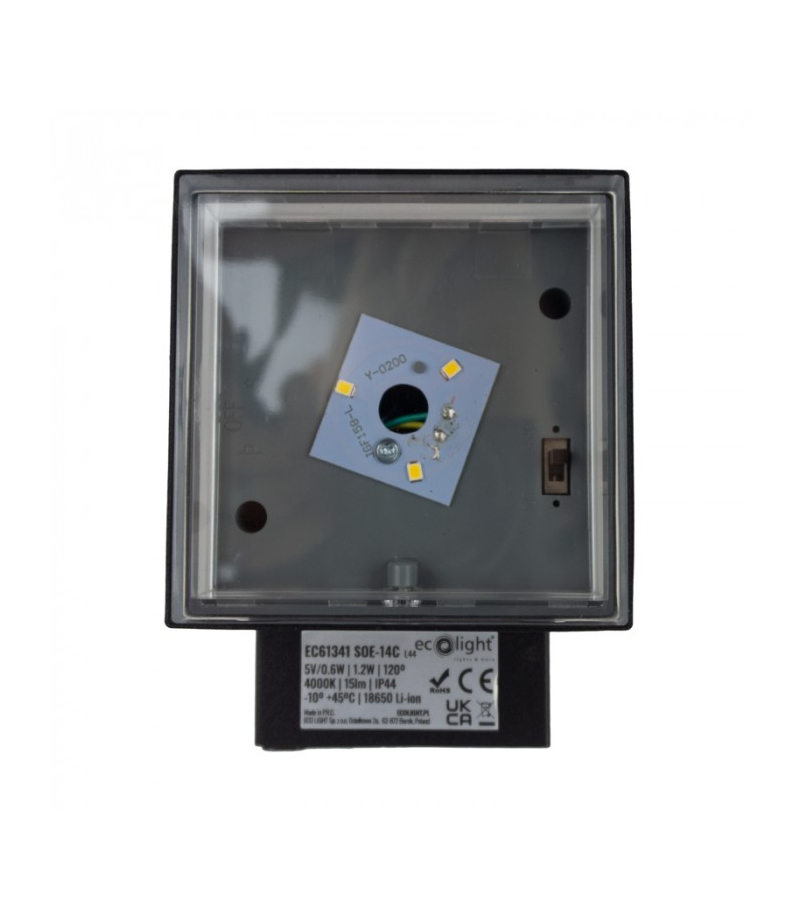 Specyfikacja: Moc: 1.2W Strumień świetlny: 15lm Czas ładowania: 8–10 godzin Czas pracy: 6–8 godzin Akumulator: 18650 Li-Ion 1200mAh Panel solarny: 5.5V/0.6W (wbudowany) Czujnik zmierzchu: Tak Stopień szczelności: IP44 Materiał: ABS, stal nierdzewna, PC Kolor: czarny Wymiary: 110×83×140 mm Waga: 450g Temperatura pracy: -10°C do +45°C Solarna Lampa Elewacyjna LED SOE-14 to nowoczesne i energooszczędne oświetlenie, które działa bez potrzeby podłączania do sieci elektrycznej.
