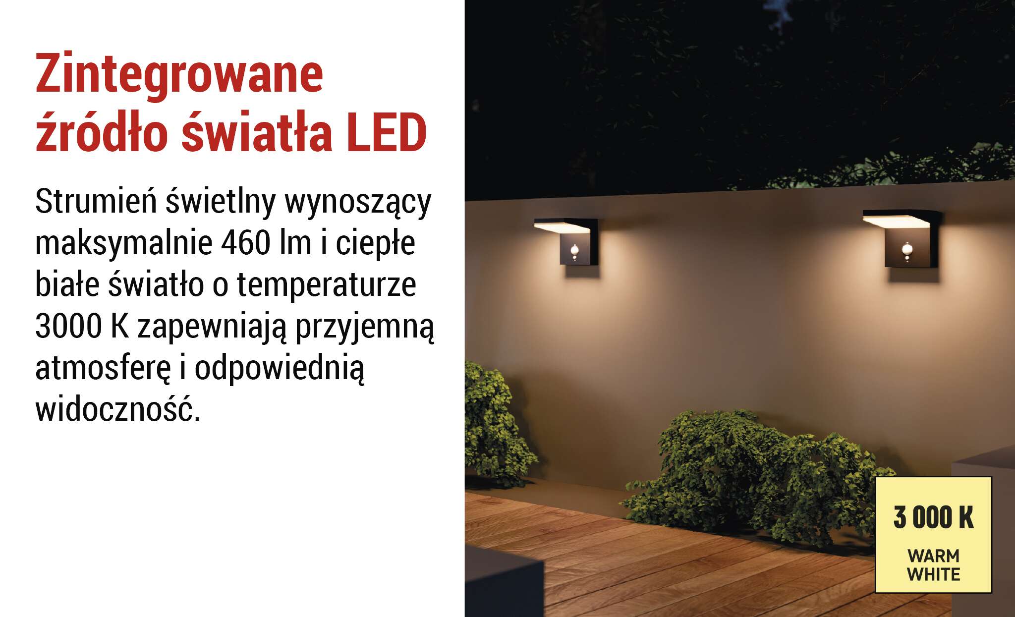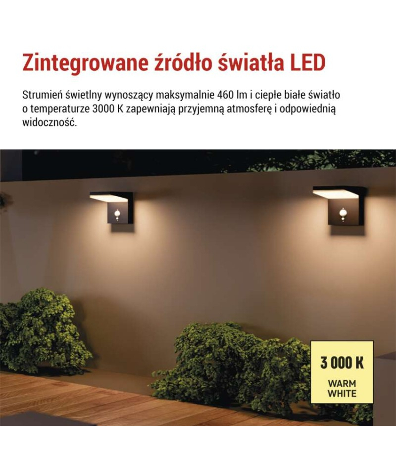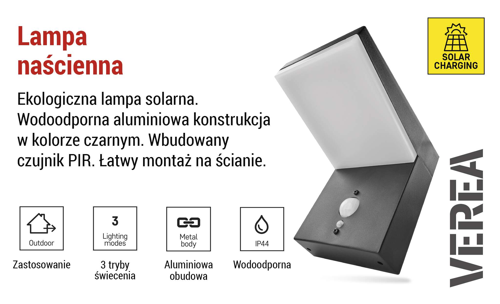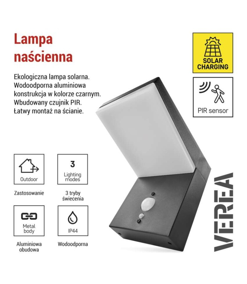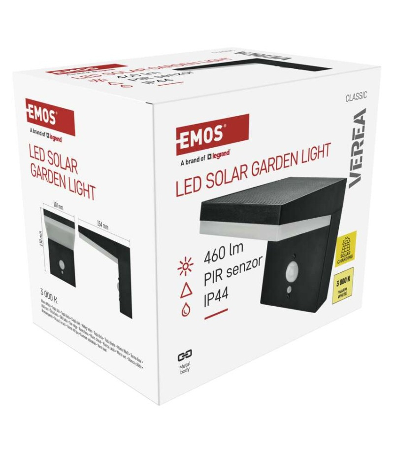 Lampa LED naścienna Garden VEREA solarna, ciepła biel, max 460 lm, IP44, PIR EMOS ZGK044S Nowoczesny design i energia ze słońca Seria VEREA to idealny wybór dla tych, którzy szukają połączenia atrakcyjnego wyglądu i niezawodnej wydajności . Ich nowoczesny design doda wyrazistego charakteru każdej przestrzeni zewnętrznej. W tej serii znajdziesz jedną lampę ścienną i jeden słupek oświetleniowy , obie z wbudowanym czujnikiem PIR . Zapewniają one...