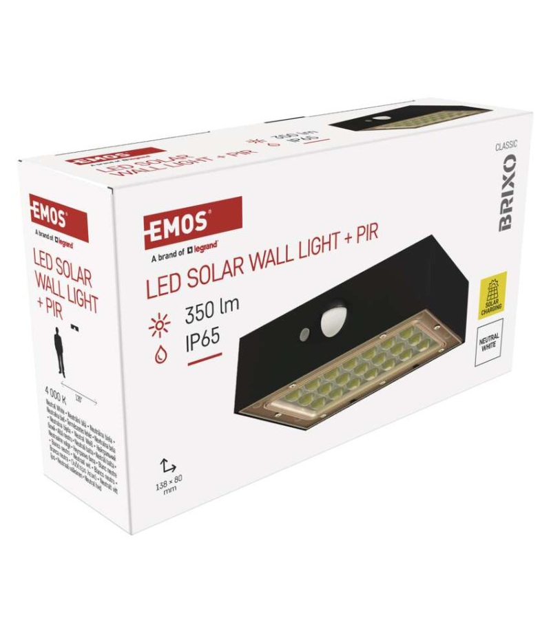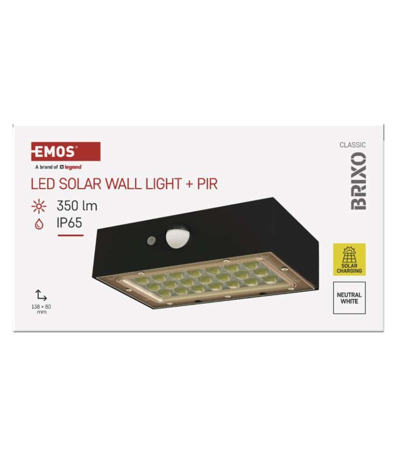 Oprawa LED Garden BRIXO solarna z PIR, 350 lm, NW, czarna EMOS ZG162S Akumulator: Li-Ion 1 200 mAh Barwa światła: neutralna biel Czas świecenia: 35 godzin Częstotliwość: nie dotyczy Czujnik PIR: tak Długość przewodu wejściowego: nie dotyczy Flicker-free: nie miga Indeks...
