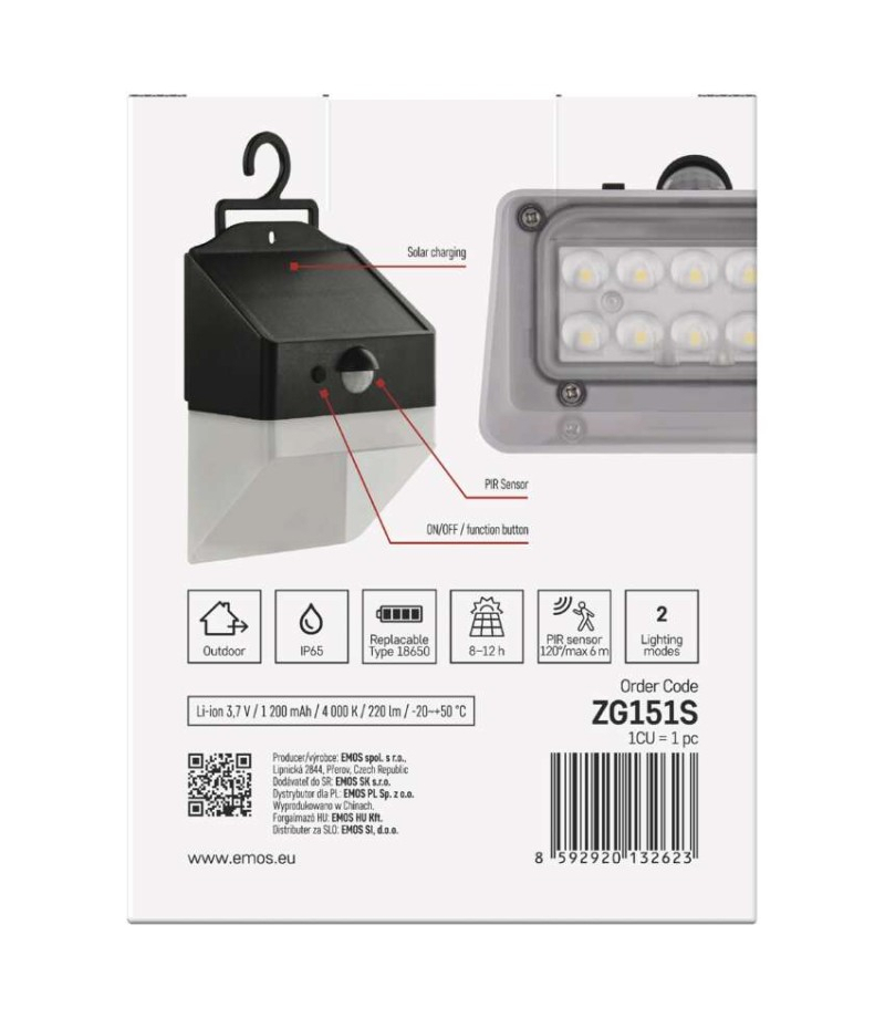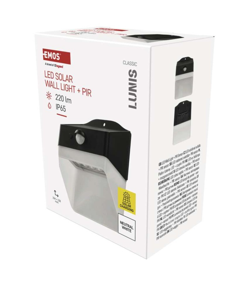 Oprawa LED Garden LUNIS solarna 220 lm, PIR, NW EMOS ZG151S Akumulator: Li-Ion 1 200 mAh Barwa światła: neutralna biel Czas świecenia: 35 godzin Częstotliwość: nie dotyczy Czujnik PIR: tak Długość przewodu wejściowego: nie dotyczy Flicker-free: nie miga Indeks oddawania...