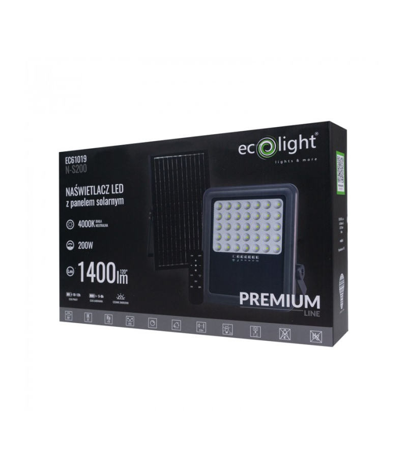 Naświetlacz LED ABS 200W 4000K z P. SOLARNYM Eco Light EC61019 Naświetlacz LED ABS 200W 4000K z Panelem Solarnym Wysokość: 249 Szerokość: 49 Kolor: Czarny Informacje dodatkowe: Sterowanie: Pilot z przyciskami Materiał: ABS Rodzaj: Naświetlacz, Solarny, LED Temperatura barwowa: 4000K...