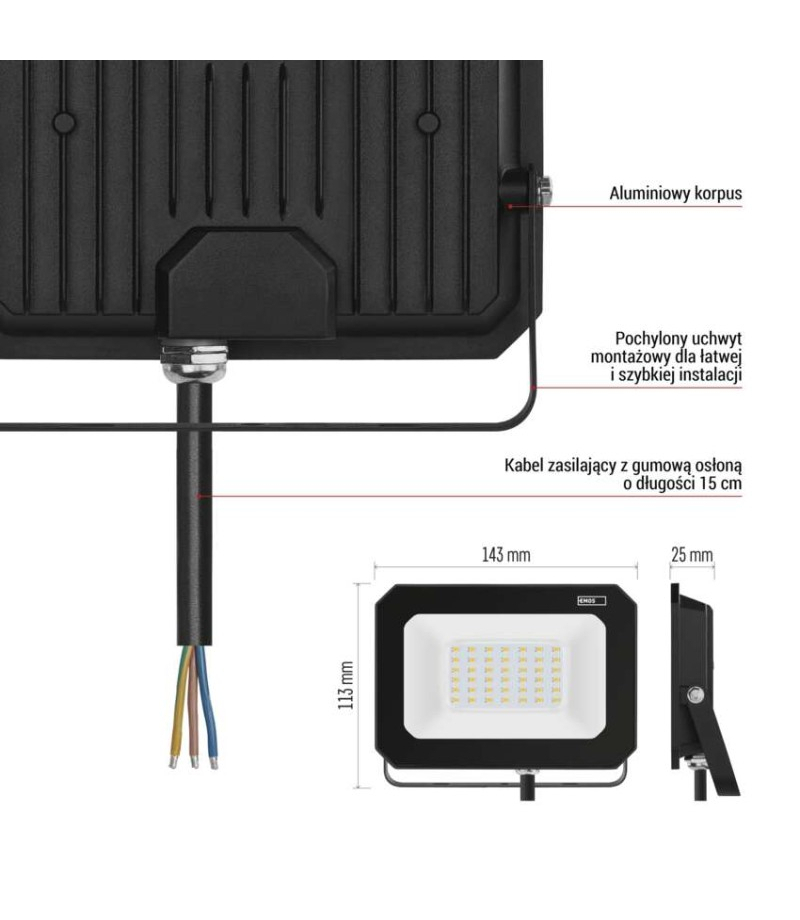 Naświetlacz LED SIMPO 20W, neutralna biel EMOS ZS2223 Akumulator: nie Barwa światła: neutralna biel Czas świecenia: nie dotyczy Częstotliwość: 50/60 Hz Czujnik PIR: nie Długość przewodu wejściowego: 20 cm Flicker-free: tak Indeks oddawania barw (CRI): Ra > 80...