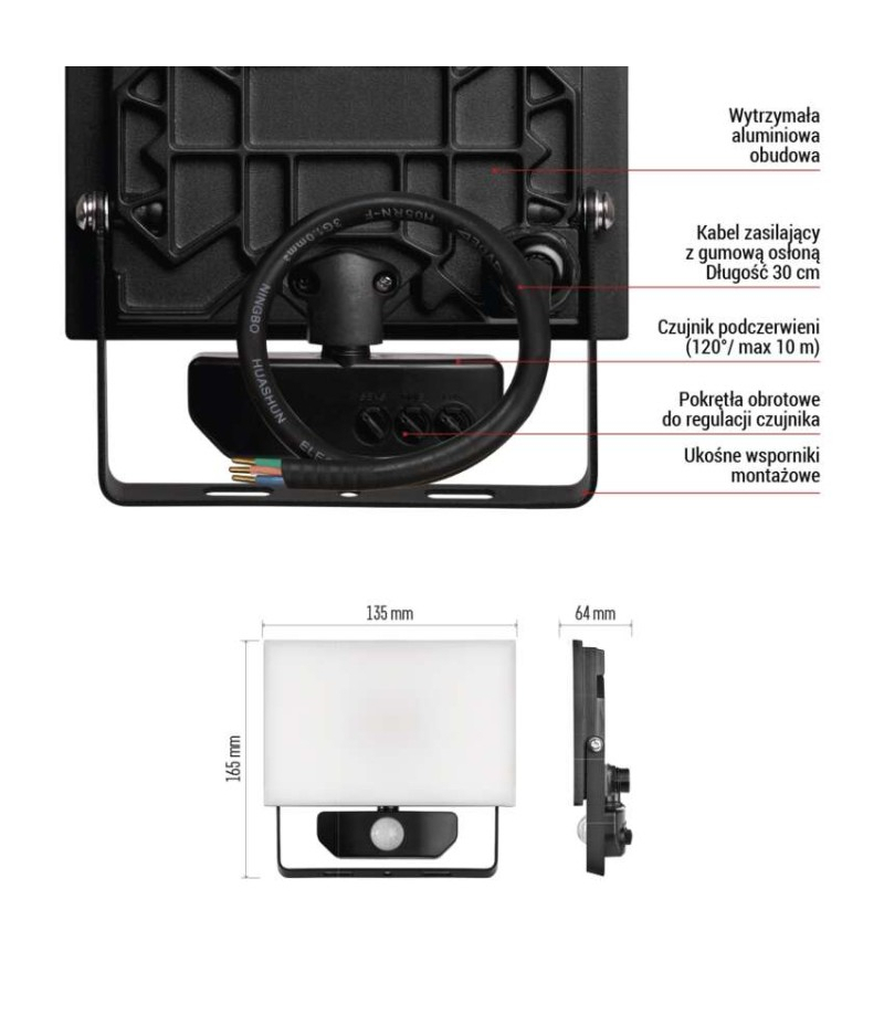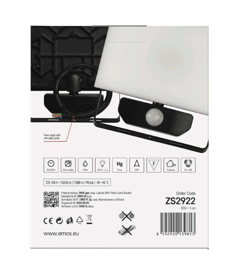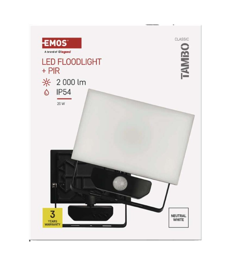 Naświetlacz LED TAMBO z czujnikiem PIR, 20 W, 2000 lm, czarny EMOS ZS2922 Akumulator: nie dotyczy Barwa światła: neutralna biel Czas świecenia: nie dotyczy Częstotliwość: 50/60 Hz Czujnik PIR: tak Długość przewodu wejściowego: 30 cm Flicker-free: tak Indeks oddawania barw...