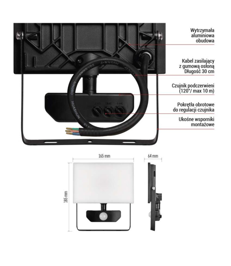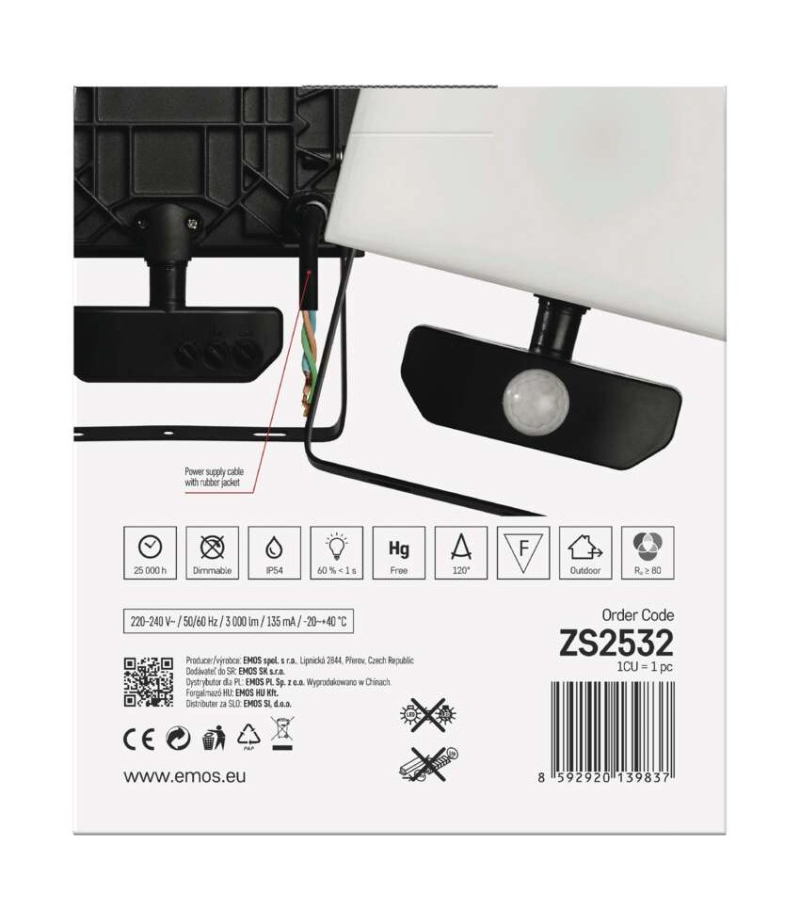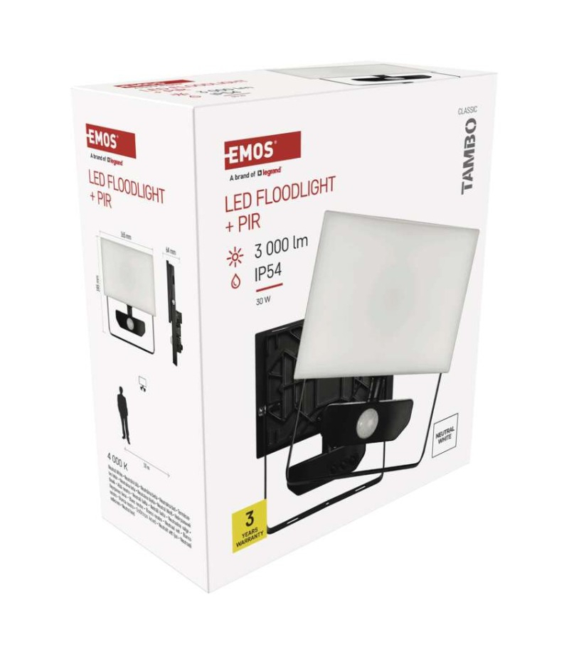 Naświetlacz LED TAMBO z czujnikiem PIR, 30 W, 3000 lm, czarny EMOS ZS2932 Akumulator: nie dotyczy Barwa światła: neutralna biel Czas świecenia: nie dotyczy Częstotliwość: 50/60 Hz Czujnik PIR: tak Długość przewodu wejściowego: 30 cm Flicker-free: tak Indeks oddawania barw...