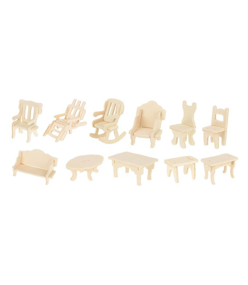 W zestawie znajduje się 34 różnych mebelków z ruchomymi elementami tj otwierane szafki. Mebelki będą kompletnym wyposażeniem każdego domku dla lalek. Komplet zawiera m.in. szafę, komodę, toaletkę z krzesełkiem, łóżko podwójne, łóżko pojedyncze, stół z krzesłami, konik bujany, umywalkę, toaletę, zestaw kuchenny i wiele innych. Mebelki występują w formie puzzli drewnianych – 3D, należy je samodzielnie złożyć.