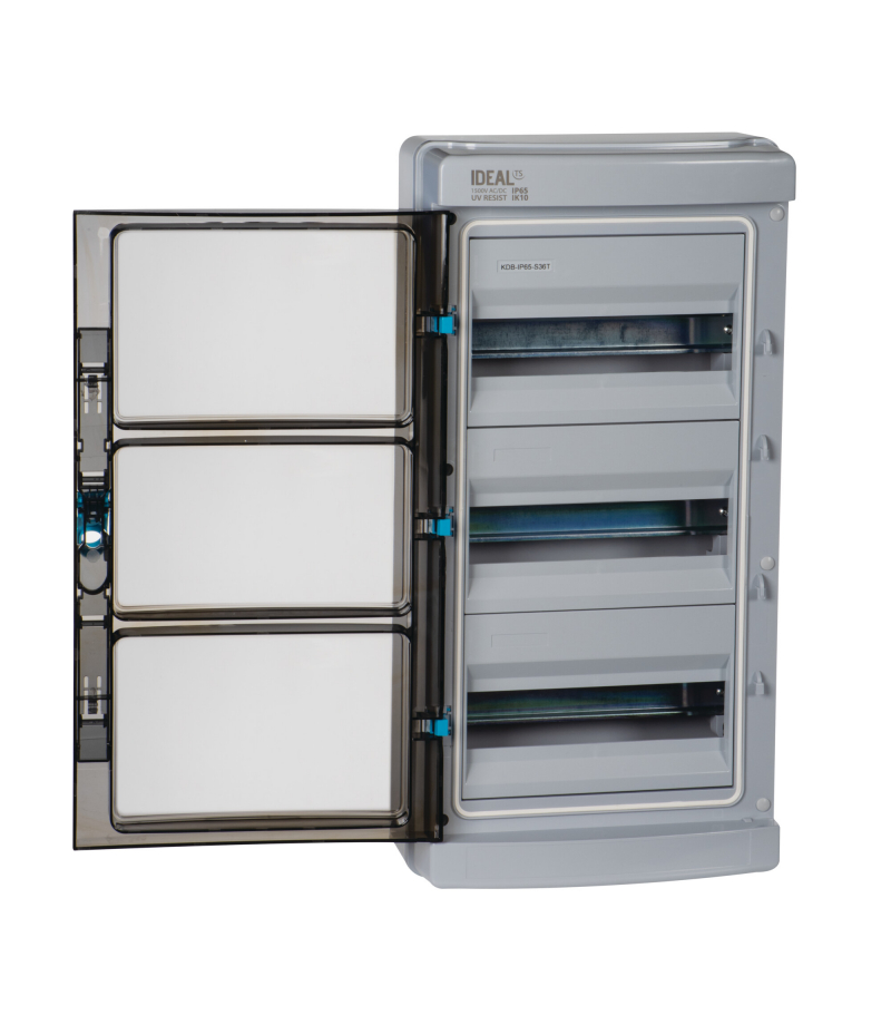 Rozdzielnica serii KDB-IP65-S36T Obudowy do zastosowań specjalnych - rodzina KDB-IP65 wyróżnia się zwiększoną odpornością na warunki atmosferyczne. Wykonane z materiału odpornego na działanie promieniowania UV, spełniają warunki odporności na wnikanie ciał stałych i wody w stopniu IP65, wytrzymałość mechaniczna na poziomie wymagań stopnia IK10. W zestawie akcesoria montażowe wraz z elementami uszczelniającymi połączenia, szyny łączeniowe, naklejki opisowe oraz zaślepki modułowe....